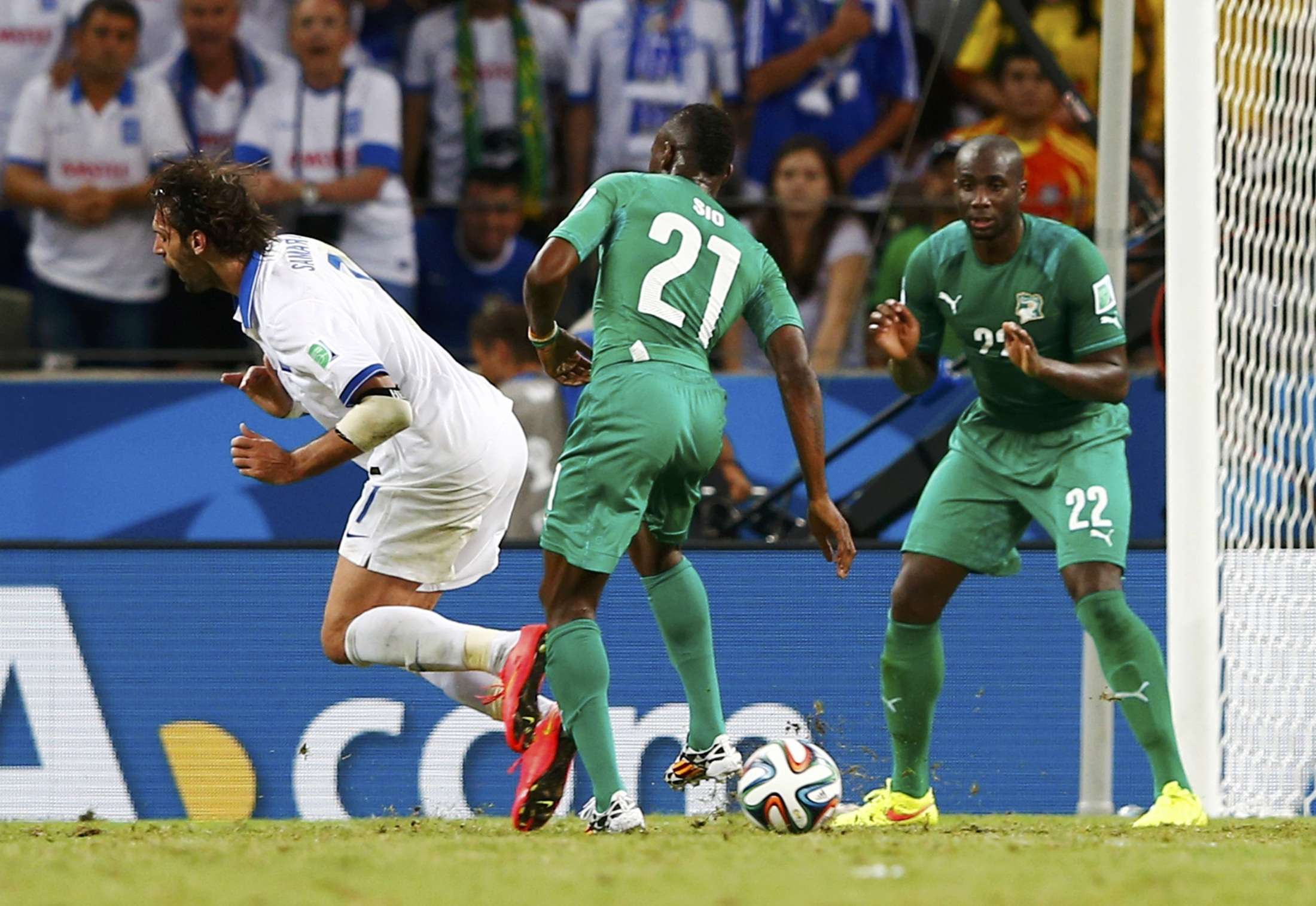 В первом тайме игравшие без дисквалифицированного чемпиона Кацураниса греки потеряли из-за травм атакующего хавбека Коне (на 12-й минуте) и вратаря Карнезиса (на 24-й). Пригрозив попаданием в перекладину Холебаса после паса Самараса, они ужалили соперника голом в раздевалку – как и россиян два года назад: Самарас и Самарис обернули нелепую потерю Тиоте быстрым выпадом. Для "слонов" этот гол не стал приговором. Ближе к концу второго тайма ивуарийцы, рисковавшие пропустить еще, все-таки отыгрались после комбинации с участием Жервинью и Бони. Ничья дарила потерявшим брата Яя и Коло Туре и их партнерам заветный плей-офф, но в нервной развязке с обменом атаками они пропустили роковой выпад на последней минуте. Самарас при попытке ударить после прострела зацепился ногой об опекавшего его со спины Сьо и выудил для себя и своей страны победный пенальти. Начав забивать в конце группового турнира, греки заскочили в 1/8 финала – и пока Колумбия будет бодаться с Уругваем, сыграют с Коста-Рикой.