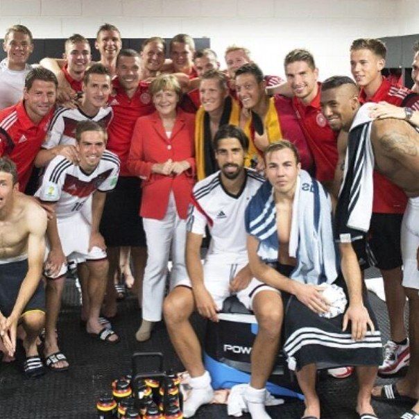 Сборная Германии с канцлером Ангелой Меркель в раздевалке после разгрома Португалии (4:0):