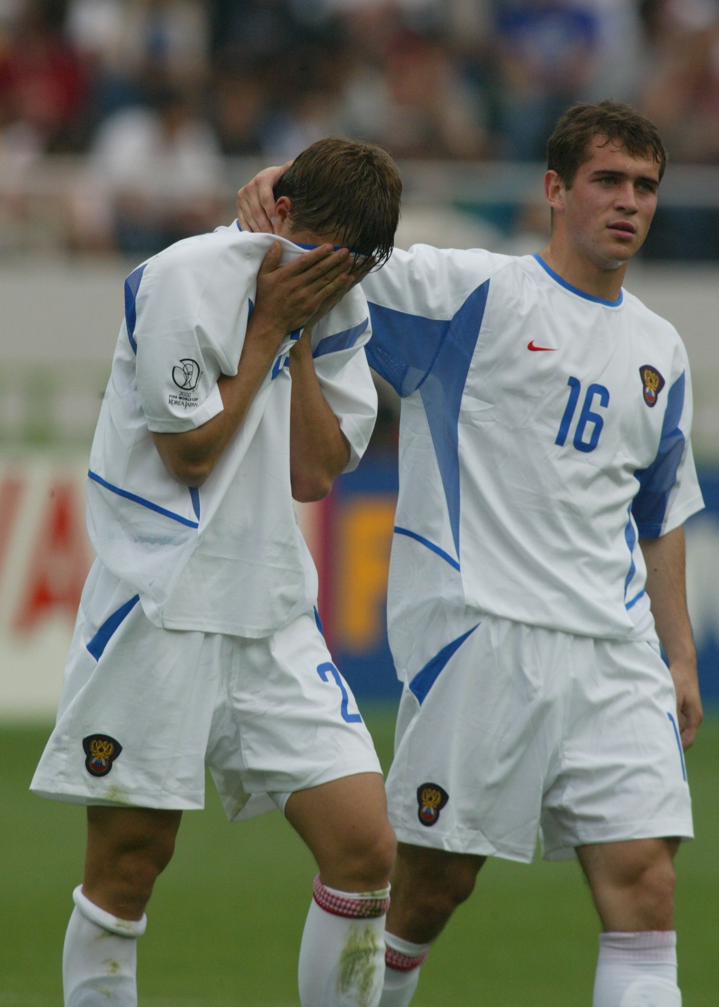 Обидно – но факт: примерно то же самое, что и в игре с Алжиром, со сборной России произошло 12 лет назад, когда наша сборная в предыдущий раз участвовала в чемпионатах мира. Было это в 2002 году, когда финальный турнир проходил в Японии и Корее. Для поколения Карпина, Мостового, Онопко, Ковтуна это был последний шанс что-то выиграть или хотя бы оставить хороший след в истории. На групповом этапе россияне тоже оказались в группе Н в компании с Тунисом, Японией и Бельгией. Все началось более чем прилично – с победы 2:0 над Тунисом. Потом последовало обидное поражение от хозяев чемпионата японцев – 0:1. Тем не менее, для того чтобы выйти в 1/8 финала, в заключительном матче группового этапа подопечным Олега Романцева достаточно было сыграть вничью с Бельгией. Но уже на 16-й минуте "красные дьяволы" повели 1:0. В начале второго тайма Владимир Бесчастных восстановил равновесие – 1:1. Однако Сонк на 78-й минуте и Вильмотс на 82-й сделали счет 3:1. Тогда Олег Романцев вслед за Сычевым выпустил на поле другого молодого игрока – Кержакова и за две минуты до конца основного времени они организовали гол – 3:2. С учетом компенсированного времени, для того чтобы забить спасительный гол у России оставалось шесть минут. Да, они прошли в атаках россиян, а Кержаков едва не забил ударом головой, но по большому счету все это было больше похоже на агонию. В итоге 3:2 выиграла Бельгия и вместе с Японией прошла дальше. Россияне остались на третьем месте.