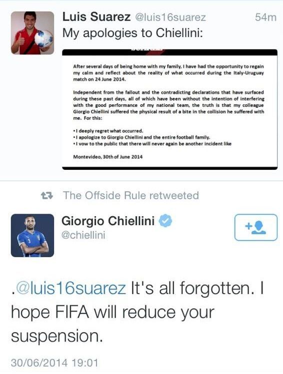 Свежо предание, но Кьеллини оперативно ответил в своем твиттере: "Все забыто. Надеюсь, ФИФА смягчит твое наказание". Правда, не все поняли и простили, кое-кто просто кое-что понял. Например, известный ныне британский эксперт Гари Линекер в своем твиттере о раскаянии легионера "Ливерпуля" написал: "Слышал, что "Барселона" настояла на этих извинениях для продолжения переговоров по переходу Суареса".