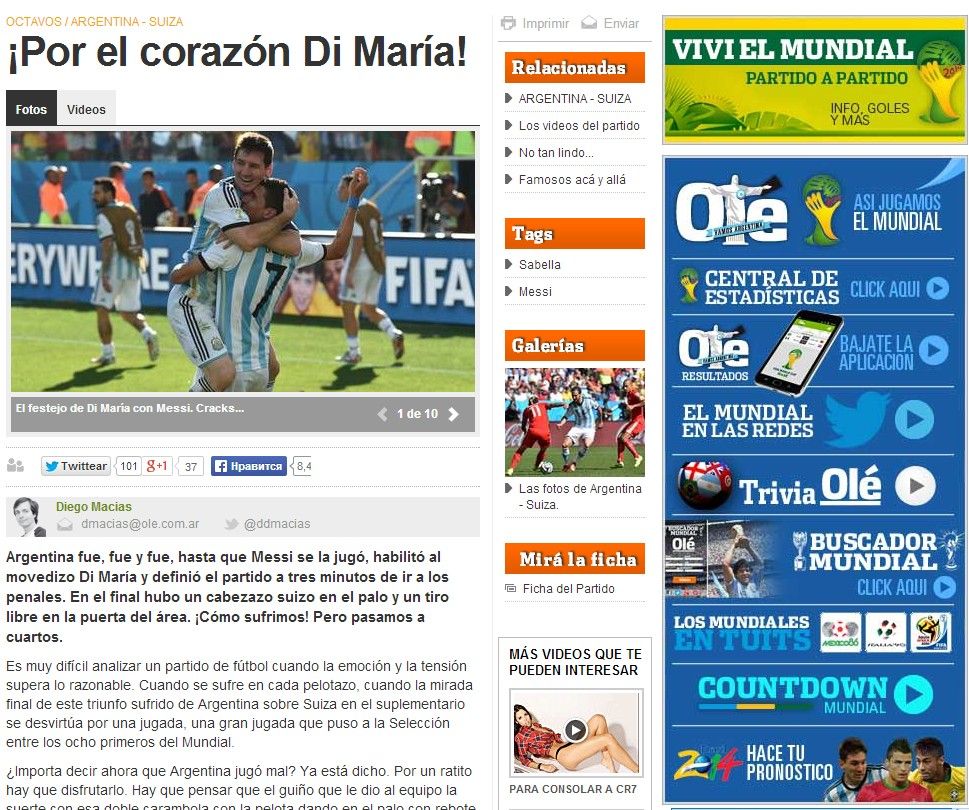 Нам остается лишь надеяться, что в следующих играх Паласио будет распоряжаться с мячом в штрафной куда более умело, что Месси будет продолжать действовать также хорошо, как всегда, что Ди Мария будет игроком, который забивает решающие голы, а не тем парнем, который не мог толково завершить ни одной атаки до этого мяча. Нам остается лишь кричать от радости после этой победы. Так как это делали все аргентинские журналисты, забыв о своей объективности. Есть чувства более сильные, чем объективность…