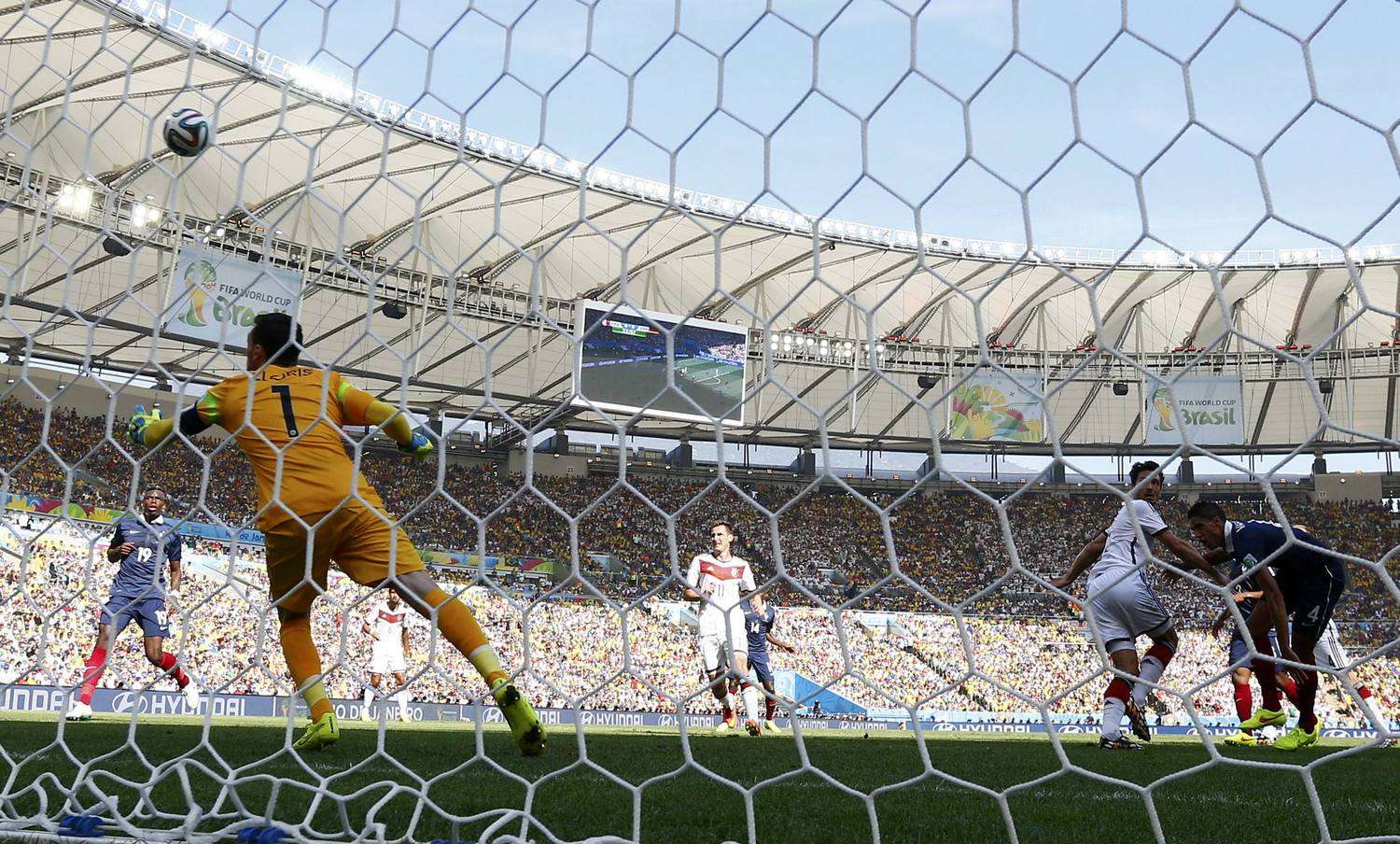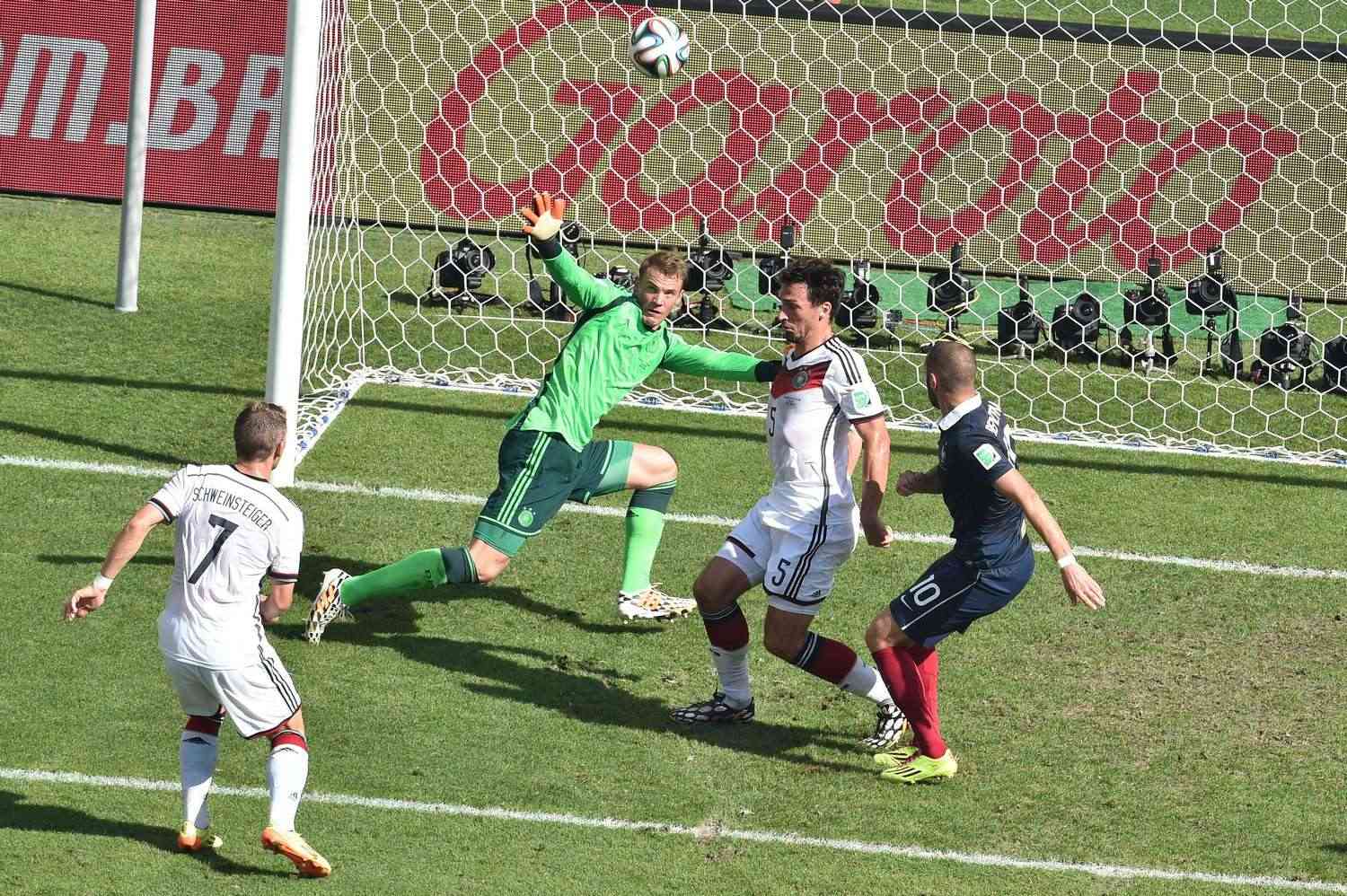 Германия повела на 13-й минуте после штрафного: плотно прихваченный соперником Кроос заставил сфолить Погба и подал в район 11-метровой отметки, Хуммельс выиграл борьбу у Варана и провел свой второй мяч на чемпионате. Так умело разыгрывающие "стандарты" немцы в 15-й раз с 2002-го забили головой, вдвое больше ближайшего из конкурентов. После этого команда Лева в первую очередь озаботилась футболом на результат. При этом заходила на пенальти в первом тайме – Дебюши сначала прихватил Клозе за футболку, потом в толкотне с тем же форвардом выставил шлагбаум постоянно лезшему в борьбу Мюллеру. В концовке создала и упустила два отменных момента. Сначала Мюллер после ввода мяча Нойером разогнал выпад и не замкнул прострел Езила слева, тогда как вышедший на замену Шюррле пробил в Ллориса. Затем Мюллер и Шюррле сделали перехват на правом фланге, но второй после паса первого не добил до вратаря.