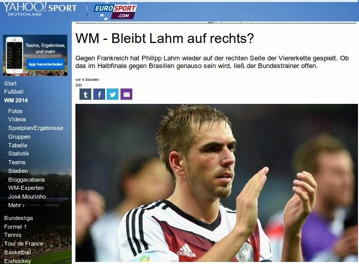 Вопрос о том, где сыграет Лам, снова интересует всю Германию. По крайнее мере, большую ее часть, следящую за чемпионатом мира. Матч против Франции капитан сборной Германии провел выше всяких похвал, считает обозреватель Eurosport Germany. Лам был, как всегда, полезен в атаке, совершив несколько подач и опасных прострелов в штрафную. Все это было куда опаснее, чем его действия в центре поля в предыдущих поединках. В обороне поначалу получалось не очень, но достаточно быстро Лам сумел подстроиться под атакующие действия Антуана Гризманна, и дела пошли получше. Так что, вполне вероятно, во вторник игрок "Баварии" опять выйдет на правом фланге, место же на скамейке снова займет Пер Мертесакер. Хотя последнее слово, понятное дело, за Йоахимом Левом. Который, по его же собственным словам, окончательного решения еще не принял.