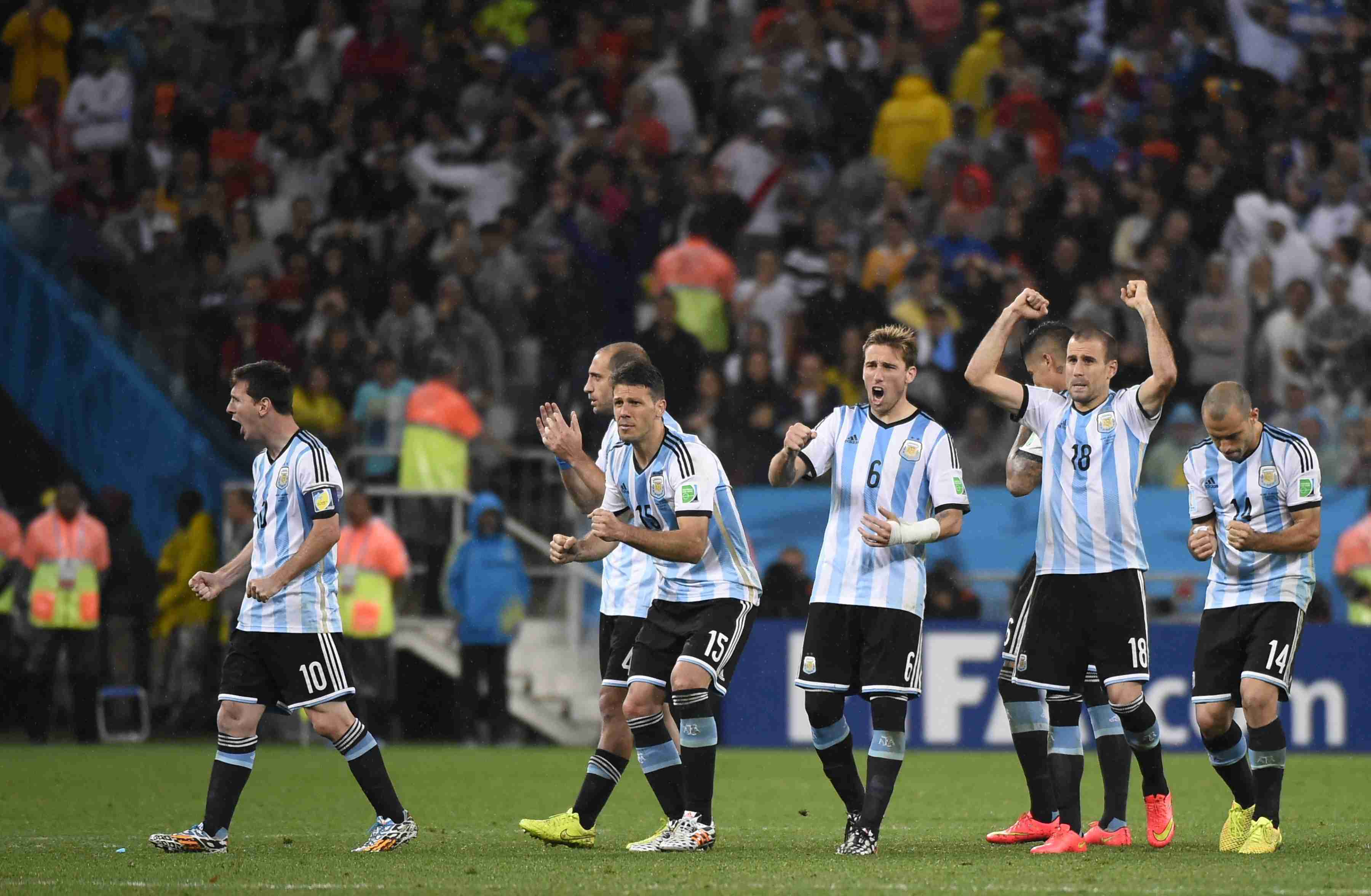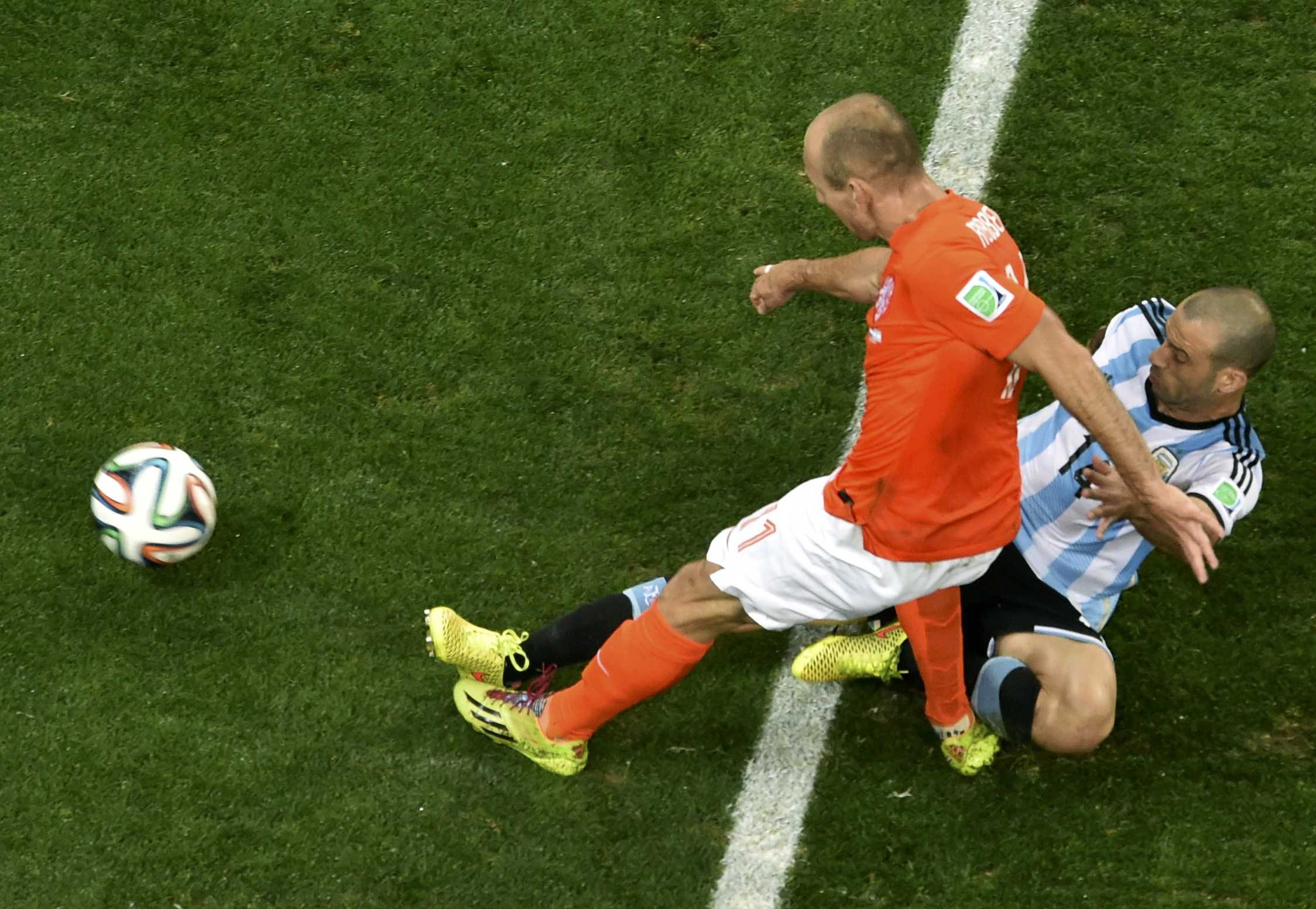 Значимость поединка и близость к финалу на "Маракане" заставила главных тренеров обеих команд направить основное внимание подопечных на нейтрализацию чужих атак и безошибочное исполнение этого плана. Так что логично, что почти незаметны были на поле лидеры обеих сборных – Лионель Месси и Арьен Роббен. Голландец получал мяч почаще (55 раз против 43). Но как только кто-то из них оказывался с мячом, вокруг, словно грибы, сразу же вырастали соперники. Месси постоянно находился под опекой Найджела де Йонга, а затем и Йорди Класи, вышедшего вместо партнера на 62-й минуте. Хотя Класи, в отличие от де Йонга, чаще выдвигался вперед, помогая своим коллегам разгонять атаки. Впрочем, аргентинский лидер может занести себе в актив то, что он вышел победителем в 12 единоборствах из 27. По суммарному количеству это второй результат для Месси в Бразилии. Больше победных микродуэлей у него было только в 1/8 финала против Швейцарии (16 из 29). Роббен же боролся крайне неудачно, выиграв только шесть единоборств из 21. И хотя ускорялся чаще всех в команде (61 раз), извлек из этого выгоду лишь однажды. В самом конце основного времени матча Роббен ворвался в штрафную площадь после обыгрыша с партнером, но его удар, имевший все шансы стать победным, в самый последний момент накрыл великолепный Маскерано.