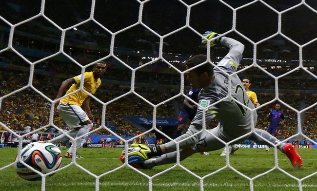 Как можно более страстно спев гимн – со стадионом и прилетевшим в Бразилиа поддержать партнеров со скамейки Неймаром, подопечные Сколари привезли себе гол в первом же выпаде голландцев. Силлессен вынес вперед, Роббен выиграл "воздух", ван Перси потолкался с Тиагу Силвой и сделал пас на реактивного партнера, которого капитан "селесао" завалил на входе в штрафную. Алжирский рефери Джамель Хаймуди в одном моменте ошибся дважды: назначил пенальти и показал желтую карточку вместо штрафного и красной. Ван Перси с "точки" организовал сотый мяч, пропущенный бразильцами в финальных турнирах чемпионатов мира. Еще одно спорное решение судейская бригада приняла, когда не зафиксировала офсайд после паса Роббена на правый фланг де Гузману. Прострел-подача и суматошный вынос Давида Луиза при провалившейся опорной зоне привели к точному удару Блинда из пределов штрафной.