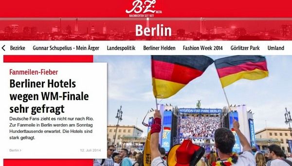 Куда большинство немцев едет перед финалом? А вот и неправильно, не в Рио – в Берлин, пишет Berliner Zeitung. В столице Германии располагается одна из самых больших фан-зон в мире. Ее протяженность составляет порядка полутора километров, и одновременно смотреть футбол тут могут тысячи человек. Во время ЧМ-2010, например, некоторые игры сборной Германии собирали по 350 тысяч болельщиков! Неудивительно, что многие хотят насладиться этой атмосферой и разделить возможную радость. Если повод действительно будет, придется туристам из других городов Германии задержаться в столице еще немного: на вторник в этой же фан-зоне запланировано чествование сборной. Если, конечно, она станет чемпионом.