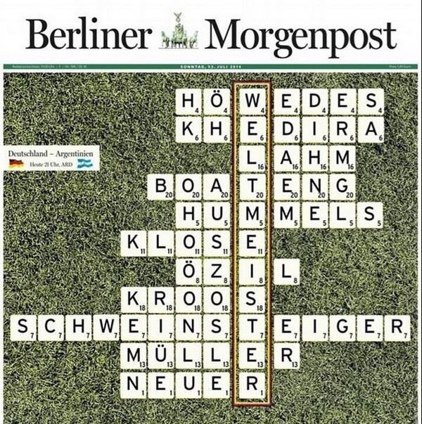 Еще накануне финала немецкая газета вышла с красноречивой первой полосой. На зеленом футбольном газоне буквами из детской игры "Эрудит" выложен кроссворд: по горизонтали - фамилии игроков стартового состава бундестим с их номерами, а по вертикали - слово "чемпионы мира" (в немецком языке это именно одно слово). Спустя сутки пророчество сбылось.