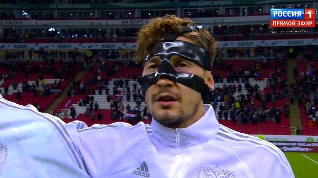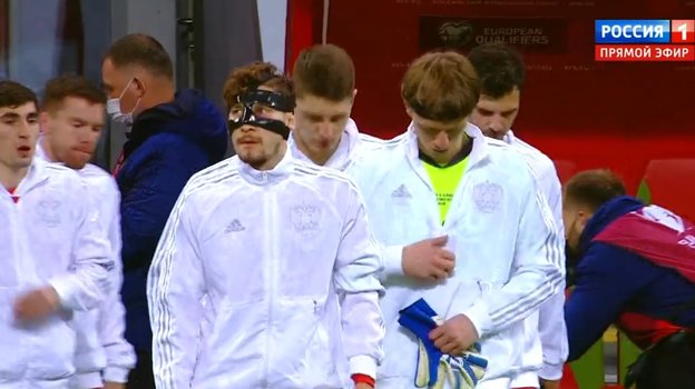 Полузащитник сборной России Далер Кузяев вышел на матч отборочного турнира ЧМ-2022 против команды Словакии в специальной защитной маске. Он получил травму лица на тренировке.