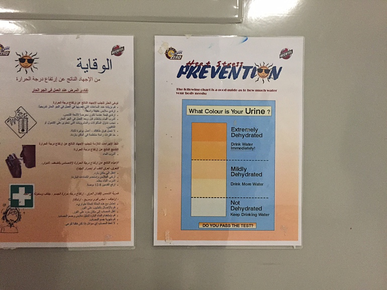 И все же жара, как выяснилось, вносит особые коррективы. Технику здесь, например, постоянно обкладывают искусственно намороженным льдом – чтобы не перегревалась. Строитель не имеет права разговаривать на работе по телефону, но обязан иметь с собой воду и постоянно ее пить. На арене встречаются плакаты, которые помогают по цвету мочи определить степень обезвоженности организма. Более того, они призывают держать этот аспект под постоянным и неусыпным контролем.