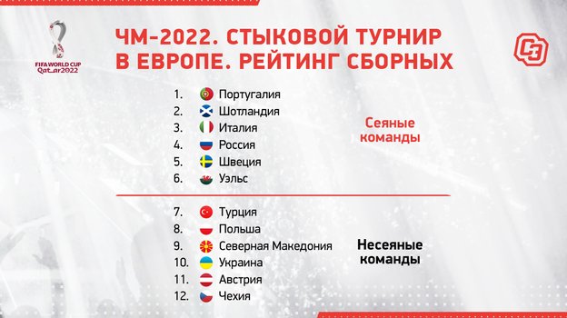 Стали известны 12 сборных, которые примут участие в стыковых матчах европейского квалификационного турнира ЧМ-2022. По регламенту это 10 команд, занявших вторые места в отборочных группах, а также две команды, заработавшие это право благодаря выступлению в Лиге наций.