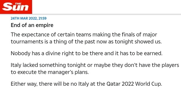 «Конец Империи» — так охарактеризовал поражение сборной Италии британский The Sun. В издании подчеркнули, что ни у одной команды нет «железного» права быть на чемпионате мира — даже у чемпионов Европы.