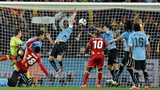 7. Ну и, пожалуй, последнее. В матче против Ганы в воротах сборной Уругвая должен сыграть Луис Суарес (вы же помните, как он выбил мяч рукой в матче этих команд на ЧМ-2010?). Не весь матч, конечно, 10 минут в концовке встречи будет вполне достаточно. Есть даже вполне легальный способ это устроить. Сначала сделать все пять замен, потом голкипер получает красную карточку, и его место должен занят кто-то из полевых игроков — выбор, разумеется, падает на Суареса. Гана, разумеется, негодует от такого черного юмора, весь остальной мир получает удовольствие.