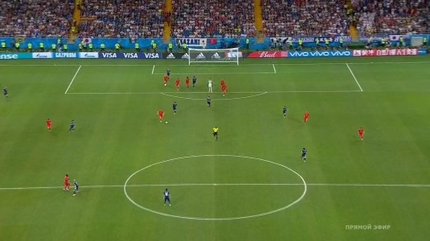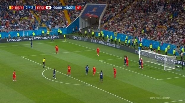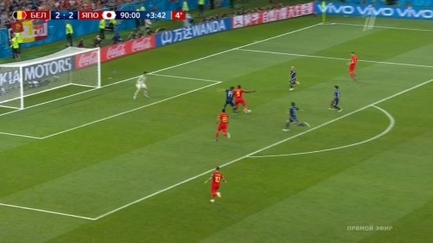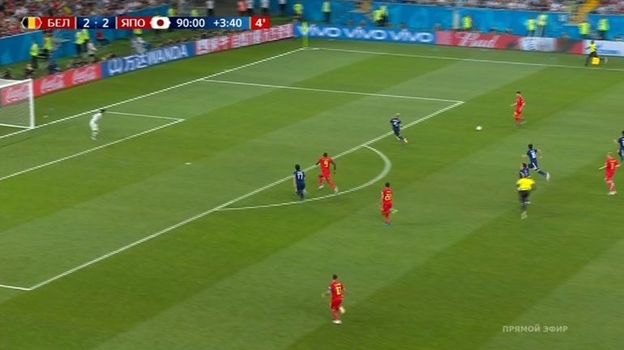 В штрафной сборной Бельгии при угловом оказалось сразу пять футболистов (четыре расположились там сразу, пятый побежал в момент подачи). Еще один игрок расположился рядом с Хондой для потенциального розыгрыша, которого в результате не случилось – и это тоже повлияло на количественный расклад сил в ходе ответной атаки. На подборе оставались только три игрока, причем двое – на своей половине поля, вдали от места событий, поэтому разрыв между линиями был огромен.
