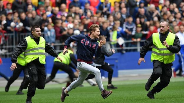 Футболисты оградили ребят от представителей служб правопорядка, пока они делали селфи. После чего детей увели с газона. (Евгений БЕЛОУСОВ)