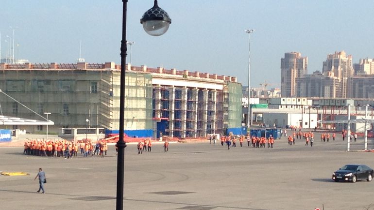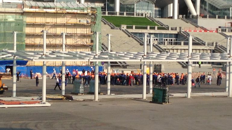 Несмотря на то, что с сегодняшнего дня перестал действовать контракт между администрацией Петербурга и генеральным подрядчиком строительства новой арены на Крестовском острове в Санкт-Петербурге, работы здесь не прекратились. В 8 утра на площади перед центральным фасадом арены как и обычно было произведено построение рабочих и развод по объектам стройки. При этом собралось не менее 500 рабочих в рабочей униформе и касках.
