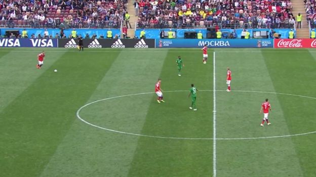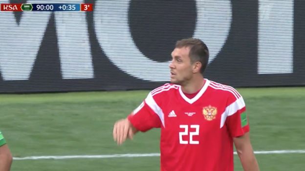 Четвертый гол сборной России в матче с Саудовской Аравией по большому счету похож на третий в том плане, что уровень сопротивления, оказанный аравийцами, был, называя вещи своими именами, просто никаким. Ситуация снова была совершенно стандартной – российская команда выполняла штрафной удар со своей половины поля. По всему было видно, что Сергей Игнашевич будет делать длинную передачу вперед на Артема Дзюбу, а тот пытаться принять мяч или сбросить его партнеру.