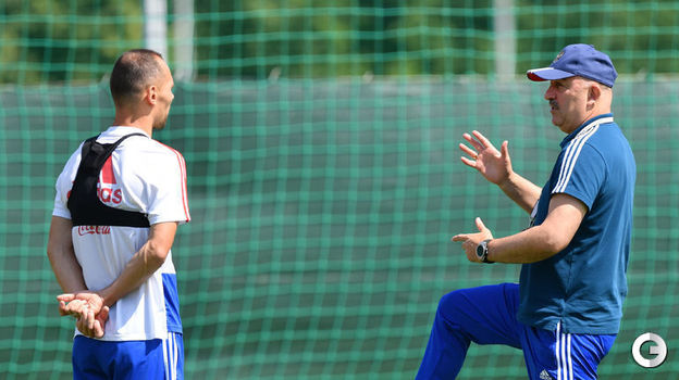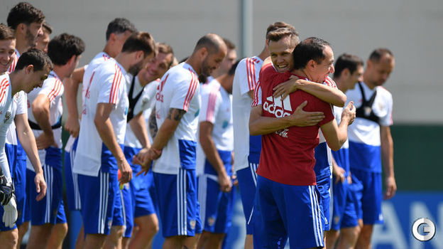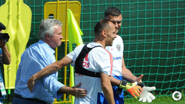 Сборная России под руководством Станислава Черчесова продолжает подготовку к матчу 1/8 финала чемпионата мира. Сегодня тренировку посетил бывшый наставник национальной команды Гус Хиддинк.