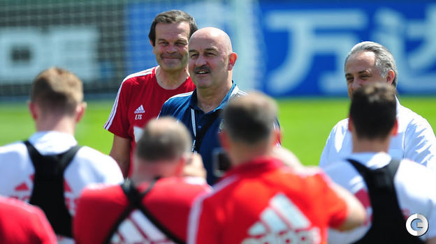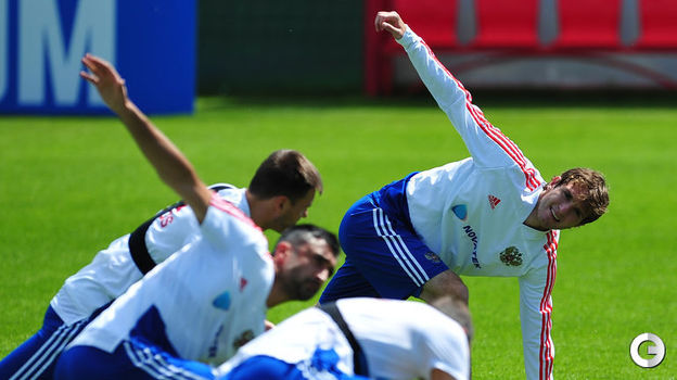 Сборная России провела очередную тренировку на базе в Новогорске. Перед началом занятия команда и навестивший ее вице-премьер РФ Виталий Мутко поздравили с днем рождения полузащитника Алана Дзагоева – игроку ЦСКА исполняется 28 лет.