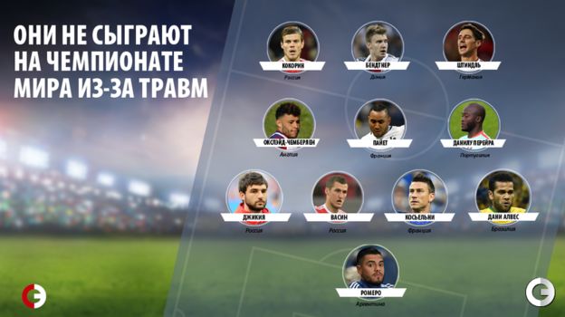 "СЭ" составил символическую сборную из тех футболистов, которые пропустят главный турнир года из-за различных повреждений. Сборная России перед чемпионатом мира-2018 пострадала сильнее всех.