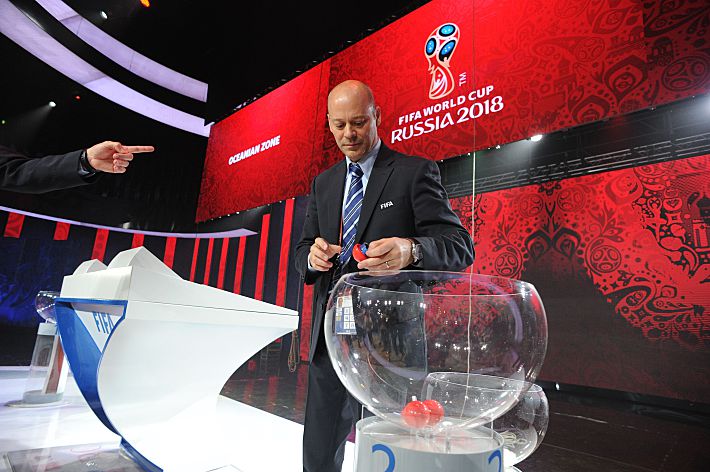 На сцене их сменил глава департамента ФИФА по проведению ЧМ-2018 Кристиан Унгер, который решил лично продемонстрировать, как будет проходить жеребьевка. Для этого он поднялся на специальный подиум, где уже были установлены корзины с красными шарами.