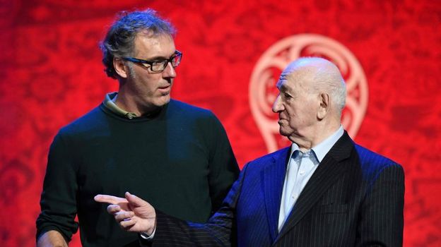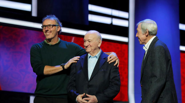 Чемпион мира-1998 в составе сборной Франции Лоран БЛАН, первый вице-президент РФС Никита СИМОНЯН и легендарный английский голкипер Гордон БЭНКС (слева направо). Фото REUTERS