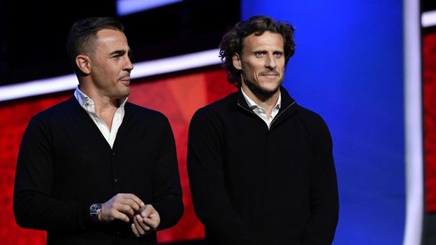 Вчера. Москва. Фабио КАННАВАРО (слева) и Диего ФОРЛАН (второй справа) на репетиции церемонии жеребьевки. Фото REUTERS
