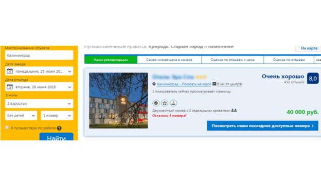 Это близко к истине: в Калининграде есть трехзвездочный отель, чуть больше недели назад просивший за стандартную двухместную комнату 120-130 тысяч рублей (даты – 16/17, 22/23, 26/27, 28/29 июня). В мае такой здесь стоит около двух тысяч, что меньше даже не в 40, а в 60 раз. В системах онлайн-бронирования указано, что сейчас доступных номеров в этой гостинице нет. В самом же отеле сказали, что они есть и подешевели до 23 тысяч рублей за ночь, но планируется еще большее понижение цены, "чтобы проблем с законом не было, ведь ожидаются проверки Роспотребнадзора".
