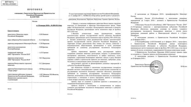 Протокол оформлен солидно, за подписью Мутко несколько постановлений. "Принять к сведению информацию", "высшим должностным лицам разработать нормативные акты, регулирующие правила содержания домашних и безнадзорных животных", "при объявлении тендеров обеспечить реализацию требований по гуманному регулированию численности бездомных животных" и все в таком духе.
