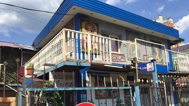 На стене соседнего дома — какое-то сатанинское изваяние. Козел с нимбом. Не по себе. Напротив еще один странный дом — весь фасад в иконах и крестах, во дворе свора собак, на калитке надпись "Он — маг черный. Опасно". Стучу в ворота, в ответ только лай, а из дома доносится церковное пение. Никто не вышел.
