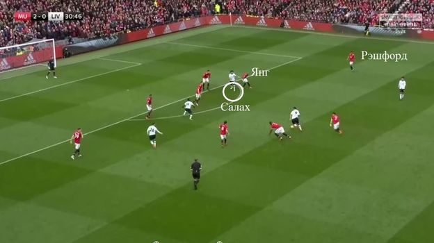 Когда Салах смещался ближе к центру, Янг также следовал за ним, а фланг в такие моменты оставался сторожить Рэшфорд, фактически превращаясь в левого защитника (а Янг, соответственно, становился левым центральным). Лучший бомбардир "Ливерпуля" остался без пространства, а персональная опека "МЮ" не привела к появлению свободной зоны, поскольку эту самую зону грамотно заполнял другой футболист.