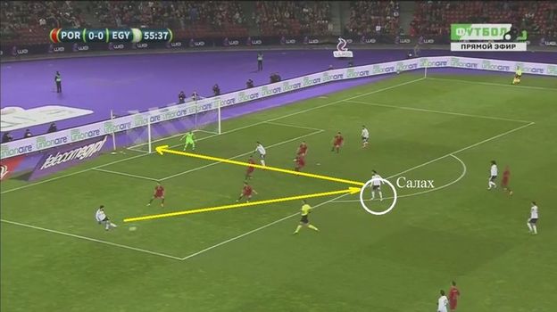 Необходимо также внимательно следить за его забегами за спину под диагонали от партнеров, всегда держа форварда перед собой и располагаясь полубоком для моментального рывка в случае необходимости. А в момент фланговых прострелов и навесов нужно помнить, что Салах может как побежать к вратарской в гущу событий для попытки результативного касания, так и остаться в зоне подбора у линии штрафной. Португальцы в товарищеской игре, к примеру, на этом прогорели. Салах развернул атаку налево, все защитники рванули к воротам – а Мохамед в зоне второго темпа получил обратный пас и спокойно уложил мяч в угол.