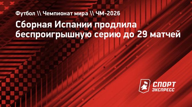 Сборная Испании после матча отборочного турнира чемпионата мира-2026 против Болгарии (4:0) продлила свою беспроигрышную серию в официальных встречах до 29 матчей, сообщает Opta.
