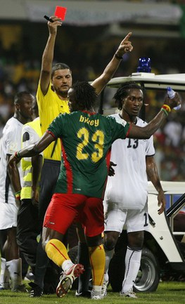 Защитник "Рединга" и сборной Камеруна Андре Бикей пропустит финал Кубка Африки из-за глупого удаления. Бывший футболист московского "Локомотива" на последней минуте полуфинального матча с хозяевами турнира ганцами затеял разборки с членом медицинского персонала, за что получил красную карточку. Досталось 23-летнему футболисту и от зрителей. Когда Бикей покидал поле, его начали забрасывать бутылками с водой, так что камерунцу потребовался эскорт, чтобы добраться до раздевалки. |