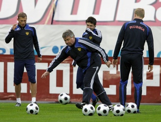 Сразу после окончания пресс-конференции в Петровском парке началась тренировка сборной, длившаяся немногим более часа. Разминка, игра в квадраты и двусторонка вызвали немалый интерес у болельщиков, которых собралось на трибунах стадиона "Динамо" около тысячи. Зрителей не отпугнул даже небольшой дождь, накрапывавший в течение второй половины занятия. |