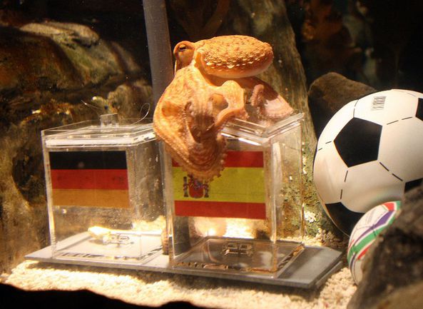 Осьминог Пауль, прославившийся точным прогнозом результатов матчей сборной Германии на чемпионате мира, предрек немцам поражение в полуфинале от сборной Испании. Напомним, что питомец океанариума Sеa Life в Оберхаузене в ходе ЧМ-2010 не ошибся пока ни разу. Метод Пауля прост: к нему в аквариум опускают два контейнера с мидиями, помеченных флагами команд-соперниц. Осьминог выбирает один из контейнеров и достает еду оттуда, прогнозируя таким образом победителя матча. При этом уместно отметить, что на чемпионате Европы 2008 года его прогнозы сбывались с вероятностью 80 процентов.