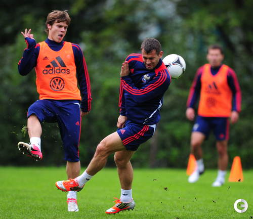 Далее сборники разделились на две команды. В оранжевые манишки облачились Бурлак, Самедов, Кокорин, Анюков, Щенников, Широков, Зырянов, А.Березуцкий, Денисов, Билялетдинов и Быстров. В синей форме сборной остались Игнашевич, В.Березуцкий, Кержаков, Глушаков, Дзагоев, Ещенко, Оздоев, Д.Комбаров и Файзулин. Дзюба же выступал в роли нейтрального футболиста, надев манишку салатового цвета. Одна команда за счет перепасовок и перемещений на половине поля должна была не позволить другой завладеть мячом - при этом игрокам на его обработку отводилось не более двух касаний. Голкиперы тем временем занимались отдельно под руководством тренера вратарей Сергея Овчинникова. Завершилась открытая для прессы часть тренировки беговыми упражнениями.