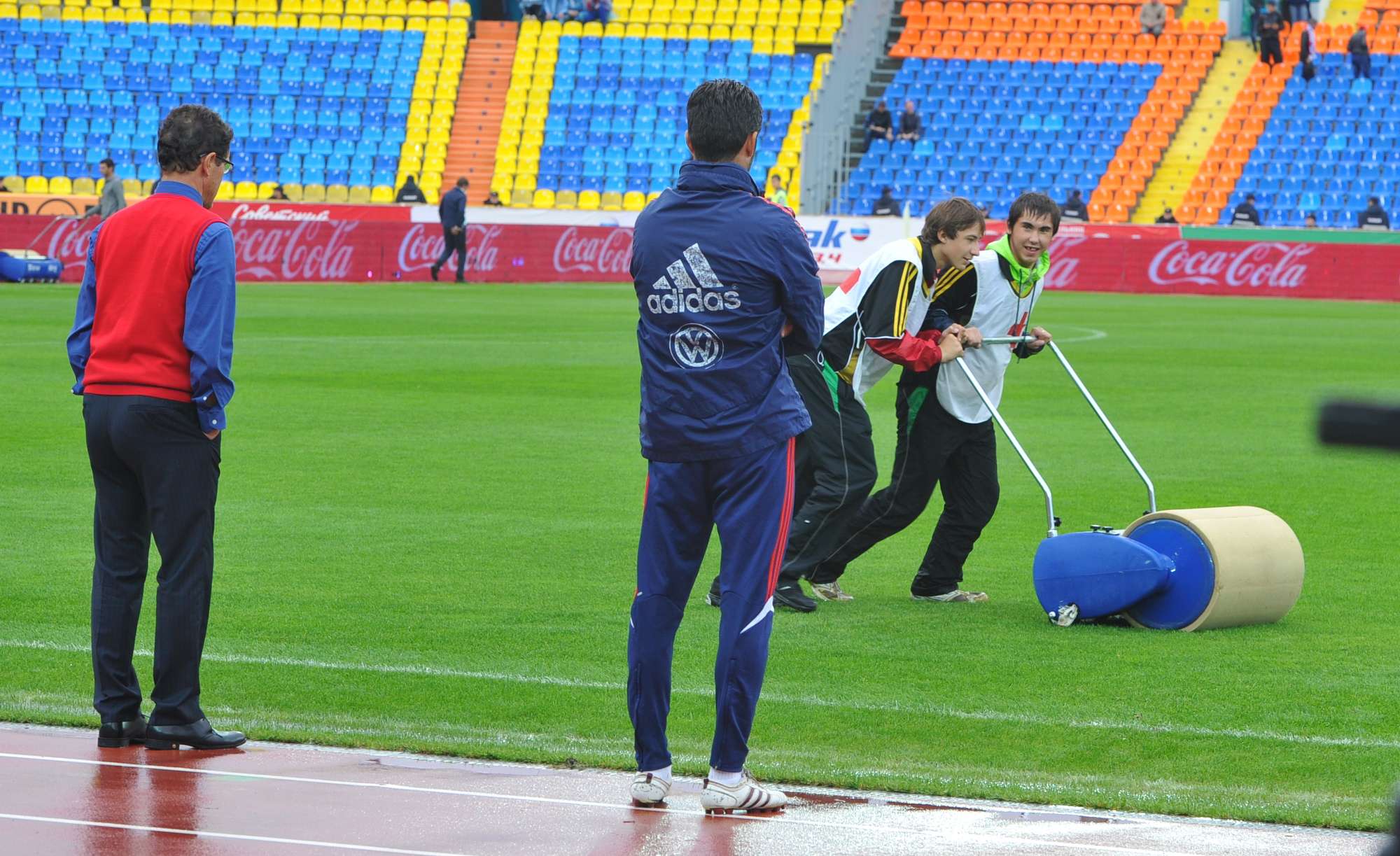 17.56. Руководство стадиона "Центральный" пока не готово дать комментарий по состоянию газона. Весь день в столице Татарстана шел дождь, однако сейчас прекратился. По предварительной информации, начало поединка будет перенесено на час и стартовый свисток прозвучит в 19:30. Пока же рабочие со своеобразными катками-губками пытаются убрать лишнюю воду с газона, а у кромки поля задумчиво стоит тренерский штаб сборной России во главе с Фабио Капелло и ряд игроков – Владимир Быстров, Игорь Денисов, Сергей Игнашевич и Александр Кержаков, передает из Казани спецкор "СЭ" Филипп ПАПЕНКОВ.