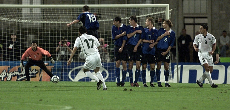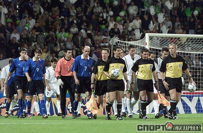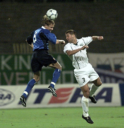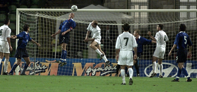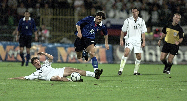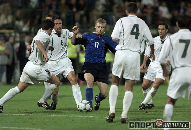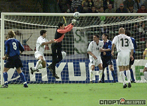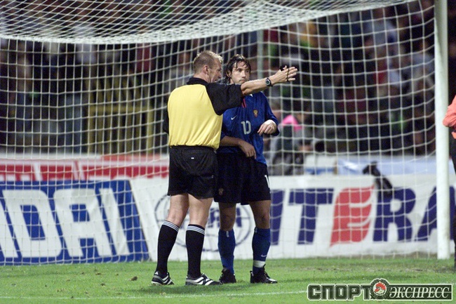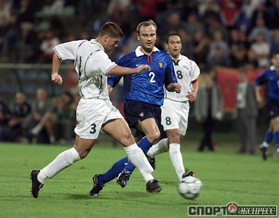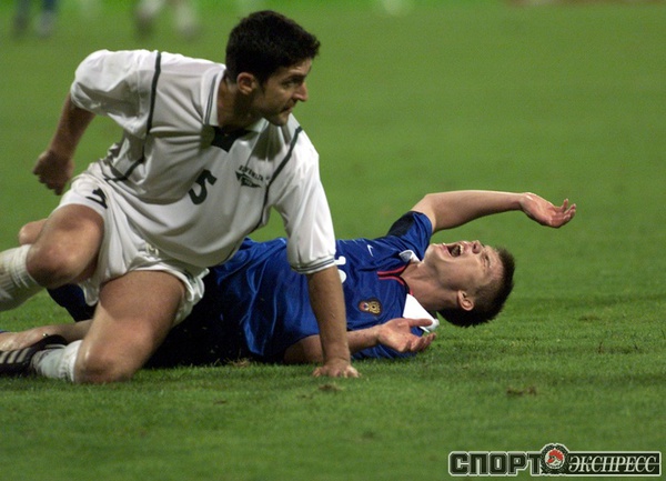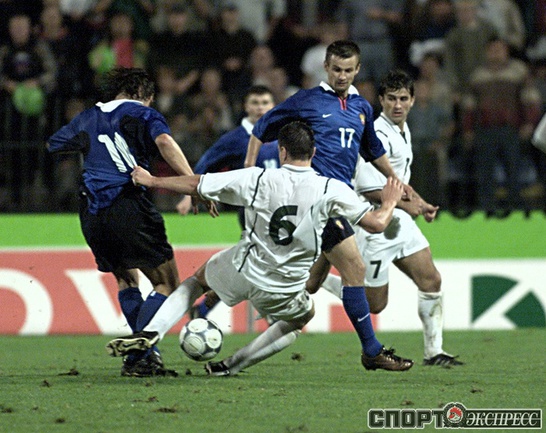 В отборочном турнире ЧМ-2002 сборная России дважды встречалась со словенцами. В Москве команды сыграли 1:1. В Любляне до 90-й минуте счет был таким же. Однако на последней минуте встречи английский судья Грэм Полл увидел "нарушение" со стороны Игоря Чугайнова и назначил одиннадцатиметровый удар. Хозяева победили, но это не помешало в конечном итоге сборной России завоевать первое место в своей группе и поехать на ЧМ-2002. Фото - Александр ФЕДОРОВ, "СЭ"