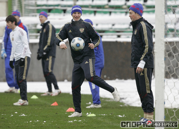 Перед отлетом в Словению сборная России провела тренировку на поле стадиона имени Эдуарда Стрельцова. Фото - Александр Вильф, "СЭ"