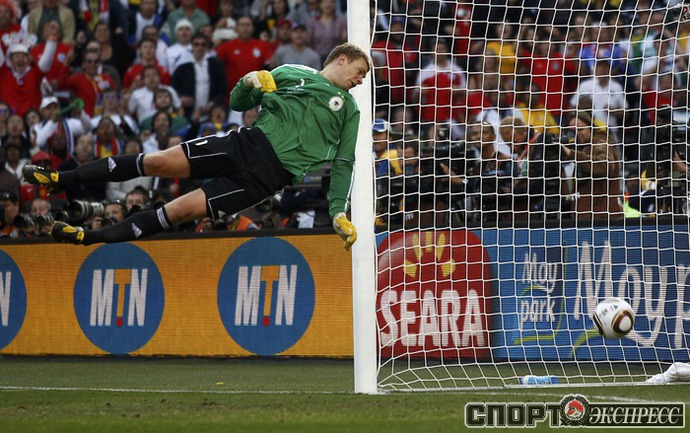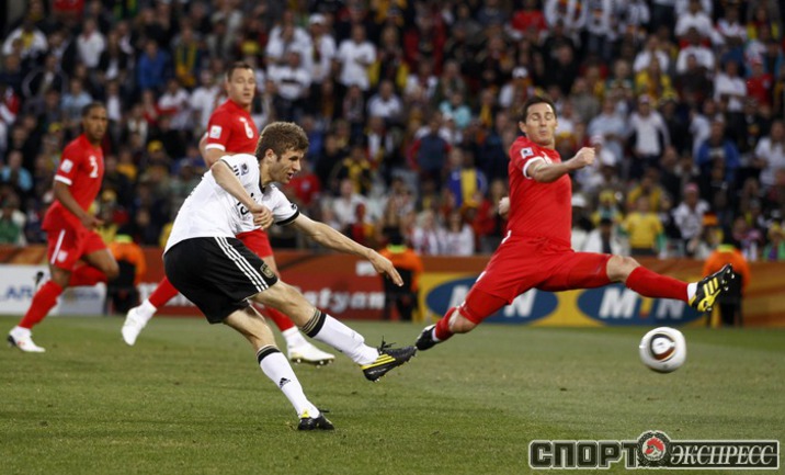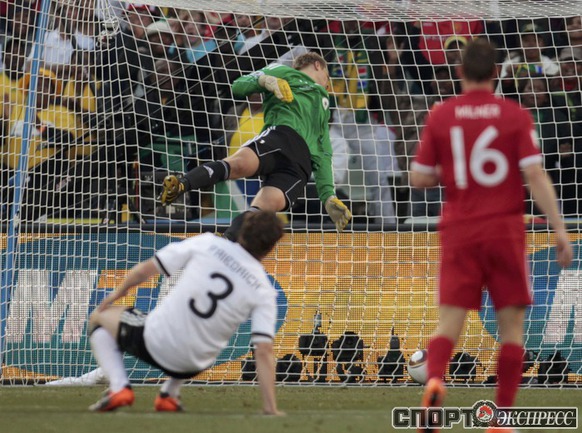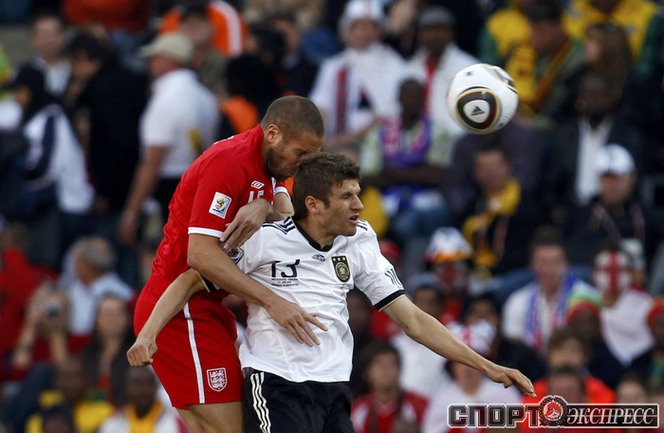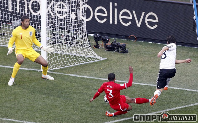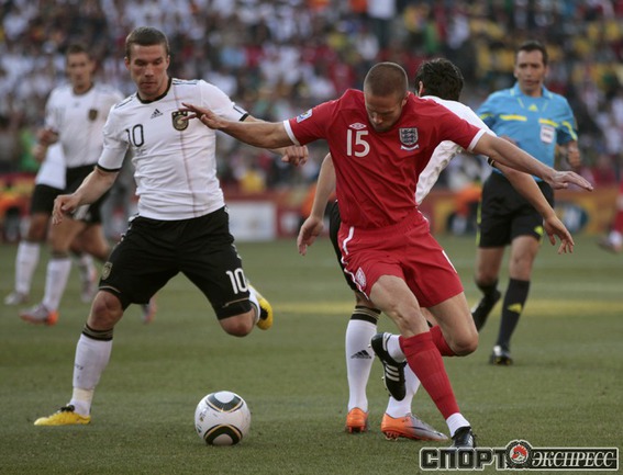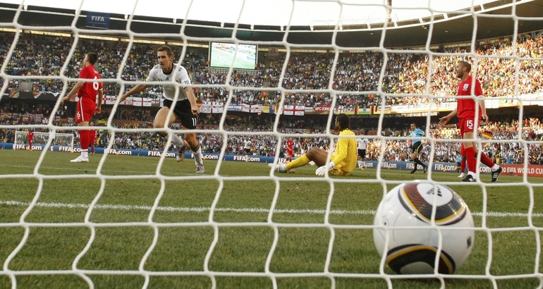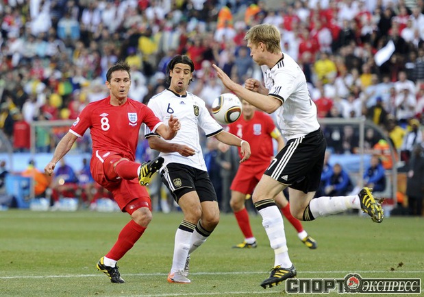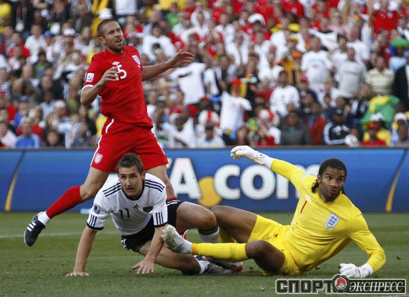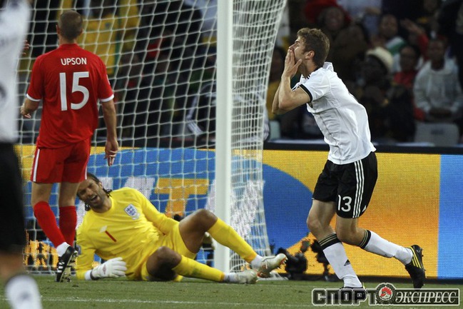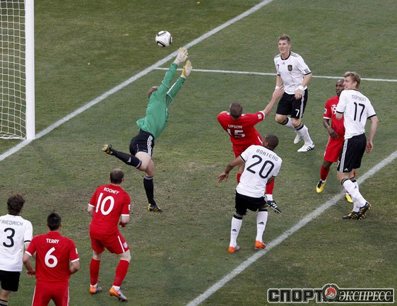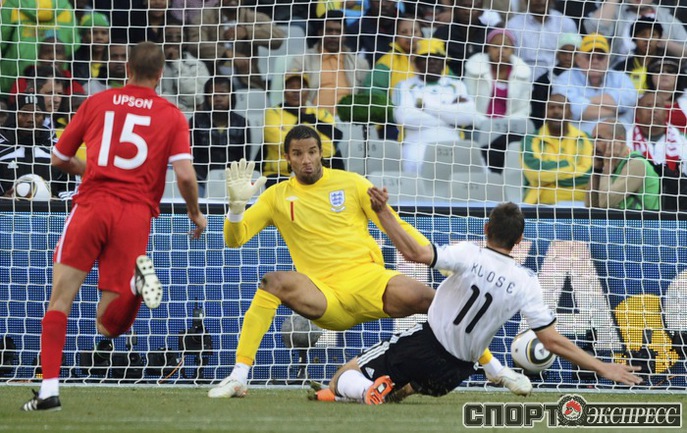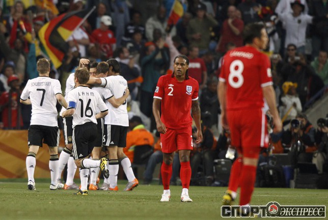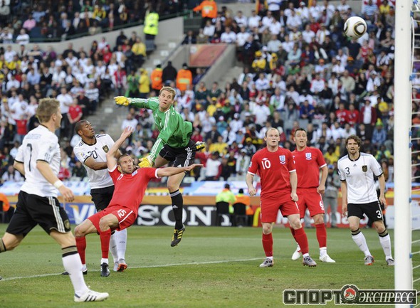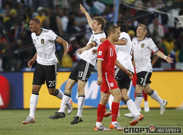 Чемпионат мира по футболу в ЮАР. Блумфонтейн. 1/8 финала. Германия - Англия - 4:1 (2:1). Голы: Клозе, 20 (1:0). Подольски, 32 (2:0). Апсон, 37 (2:1). Мюллер, 67 (3:1). Мюллер, 70 (4:1). При счете 2:1 в пользу Германии англичанин Фрэнк Лэмпард нанес удар, после которого мяч пересек линию ворот Мануэля Нойнера, но боковой судья не заметил явного гола! Похожая ситуация произошла между этими же командами в финале ЧМ-1966. Только тогда советский боковой арбитр Тофик Бахрамов засчитал спорный гол англичанина Джеффри Херста. Фото REUTERS
