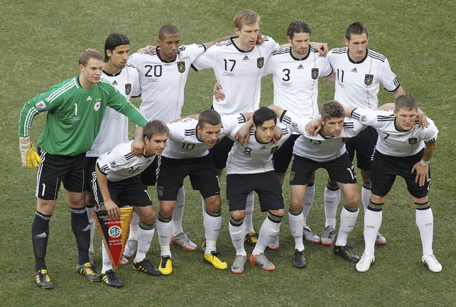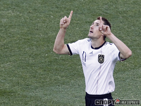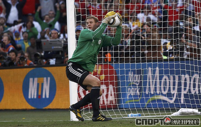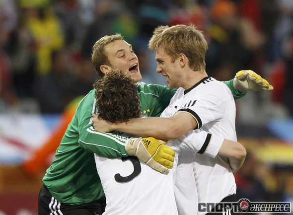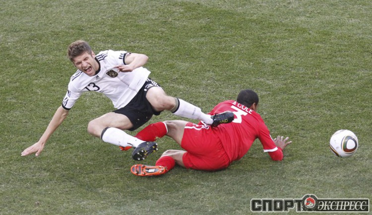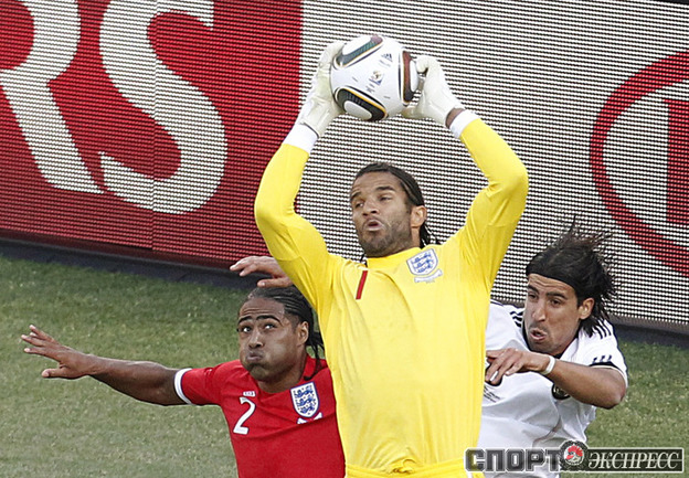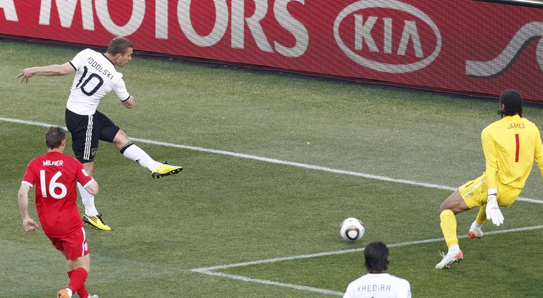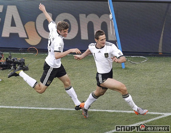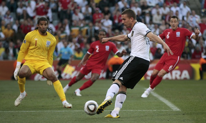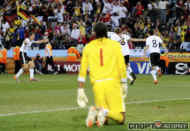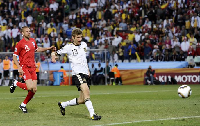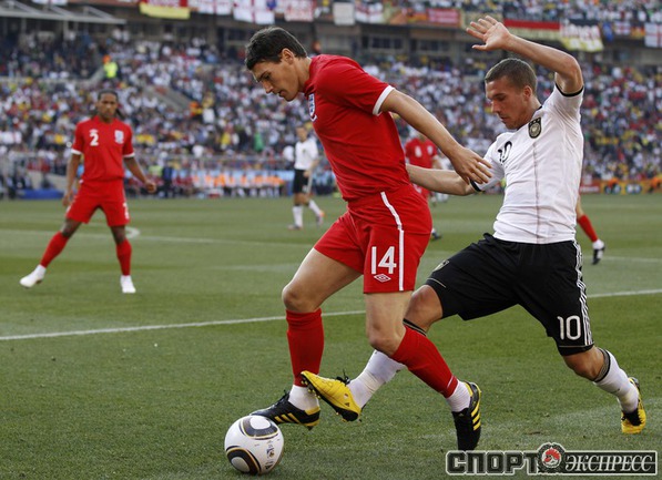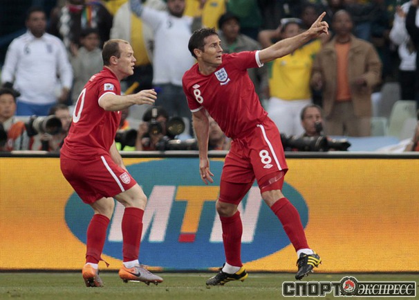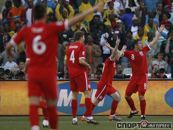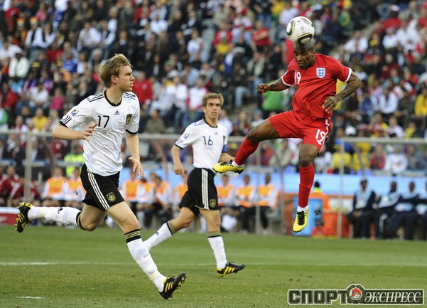Чемпионат мира по футболу в ЮАР. Блумфонтейн. 1/8 финала. Германия - Англия - 4:1 (2:1). Голы: Клозе, 20 (1:0). Подольски, 32 (2:0). Апсон, 37 (2:1). Мюллер, 67 (3:1). Мюллер, 70 (4:1). При счете 2:1 в пользу Германии англичанин Фрэнк Лэмпард нанес удар, после которого мяч пересек линию ворот Мануэля Нойнера, но боковой судья не заметил явного гола! Похожая ситуация произошла между этими же командами в финале ЧМ-1966. Только тогда советский боковой арбитр Тофик Бахрамов засчитал спорный гол англичанина Джеффри Херста. Фото REUTERS