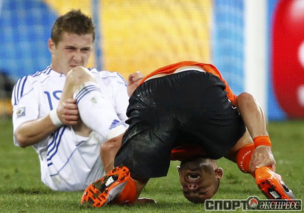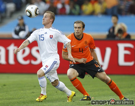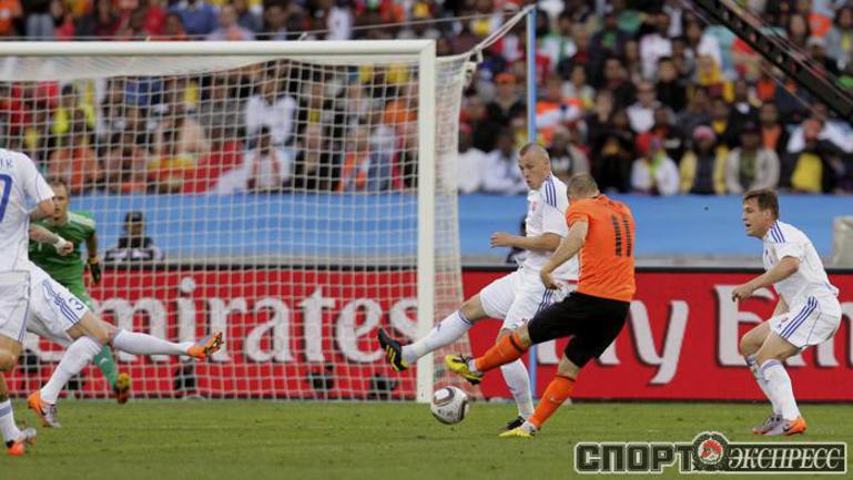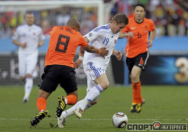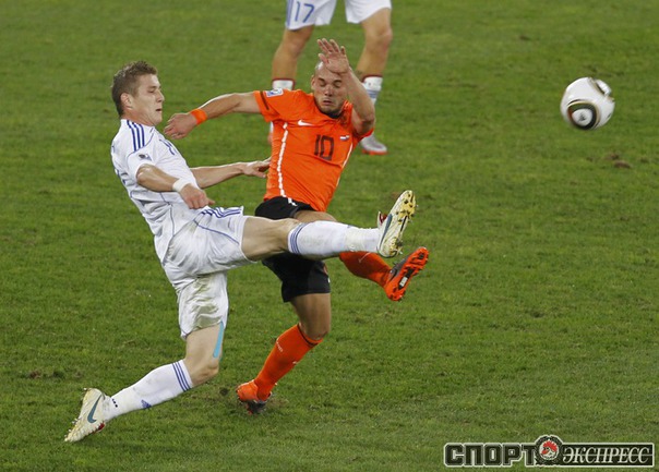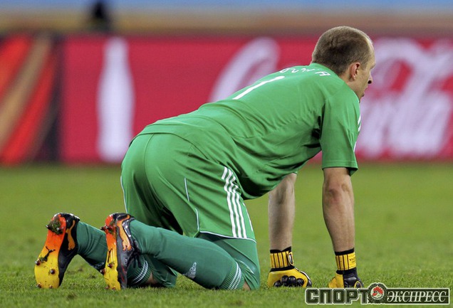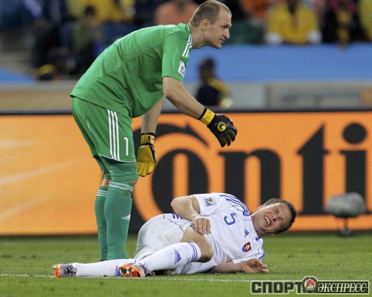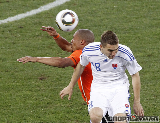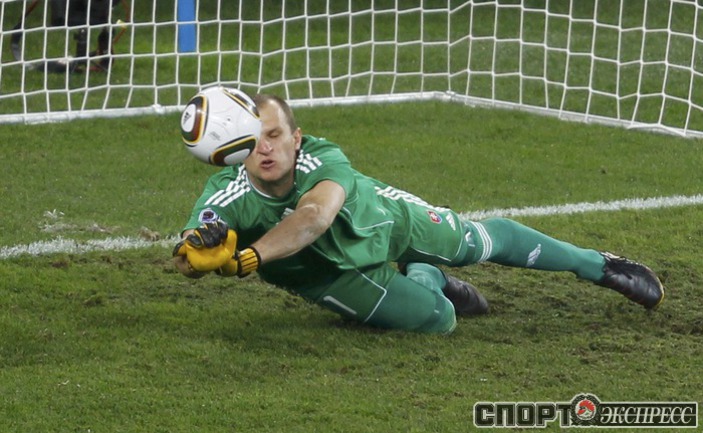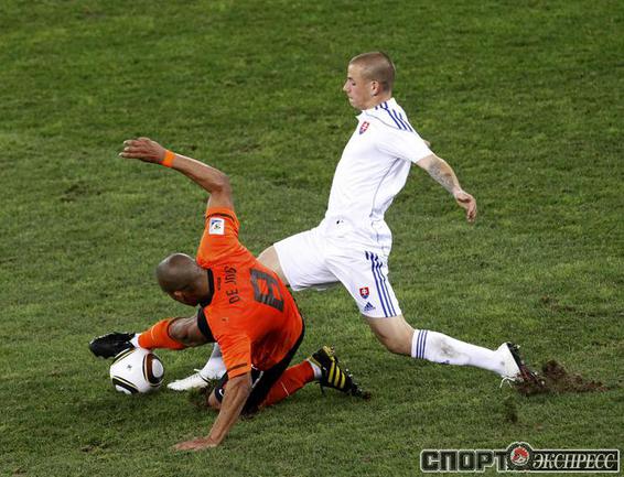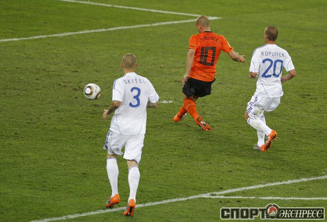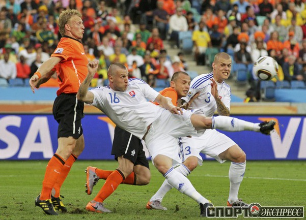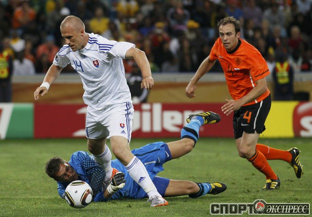 Чемпионат мира по футболу в ЮАР. Дурбан. 1/8 финала. Голландия – Словакия – 2:1 (1:0). Голы: Роббен, 18 (1:0). Снайдер, 84 (2:0). Виттек, 90+4 - с пенальти (2:1). Ошибка вратаря словаков Яна Мухи на 84-й минуте матча, когда он неосмотрительно вылетел из ворот, привела ко второму голу голландцев. Словацкий нападающий "Сатурна" Мартин Якубко появился на поле за несколько минут до конца матча и успел заработать пенальти. Фото REUTERS