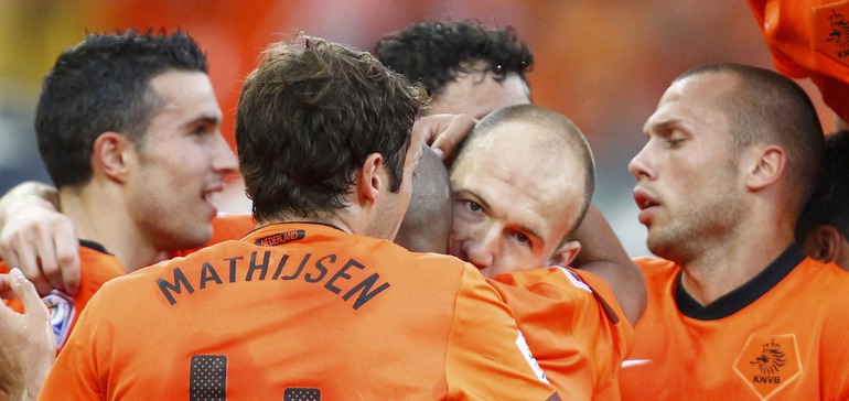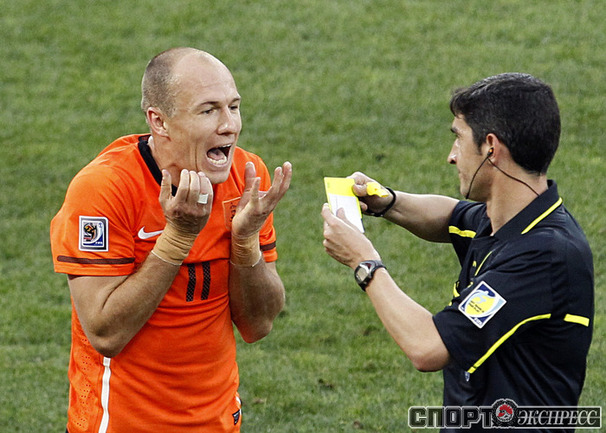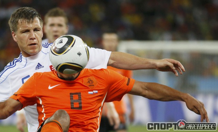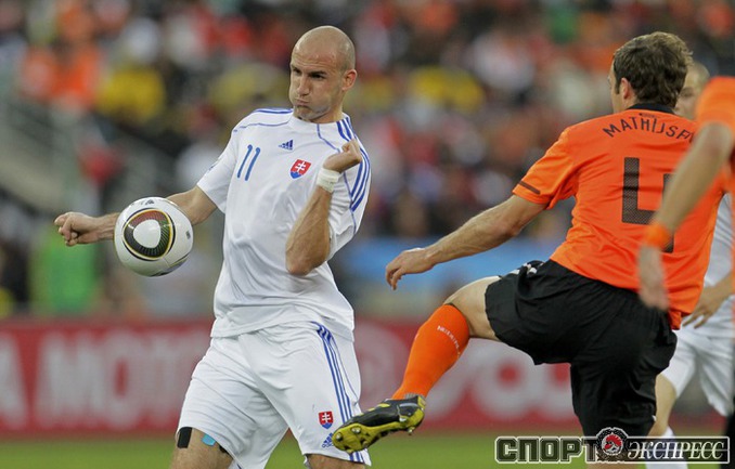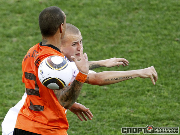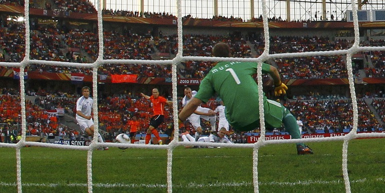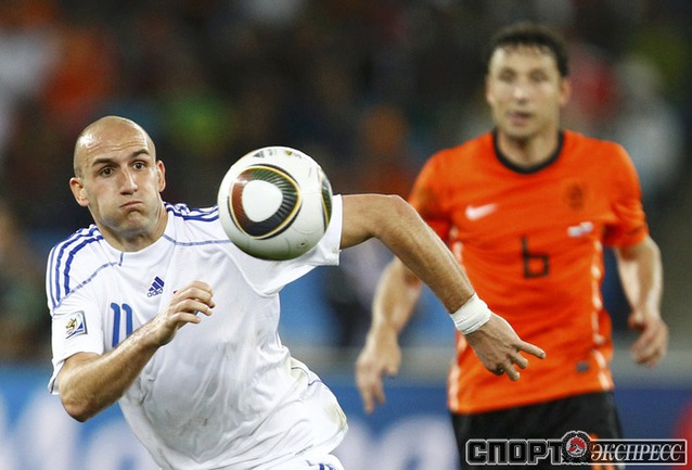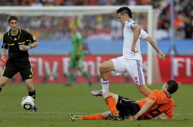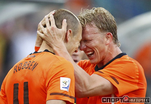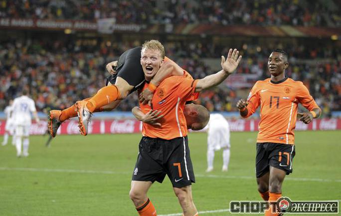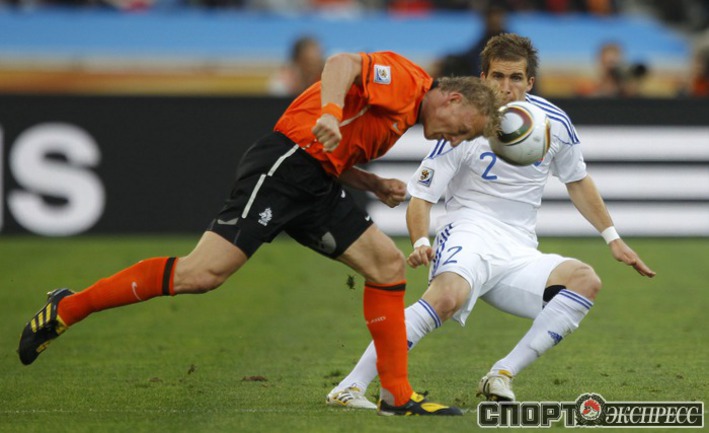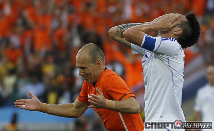 Чемпионат мира по футболу в ЮАР. Дурбан. 1/8 финала. Голландия – Словакия – 2:1 (1:0). Голы: Роббен, 18 (1:0). Снайдер, 84 (2:0). Виттек, 90+4 - с пенальти (2:1). Ошибка вратаря словаков Яна Мухи на 84-й минуте матча, когда он неосмотрительно вылетел из ворот, привела ко второму голу голландцев. Словацкий нападающий "Сатурна" Мартин Якубко появился на поле за несколько минут до конца матча и успел заработать пенальти. Фото REUTERS