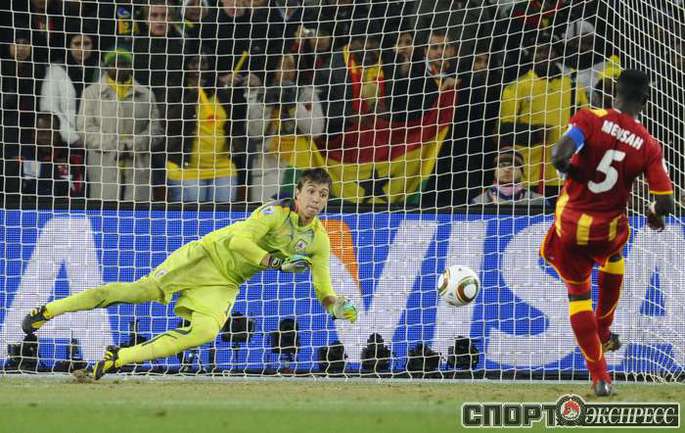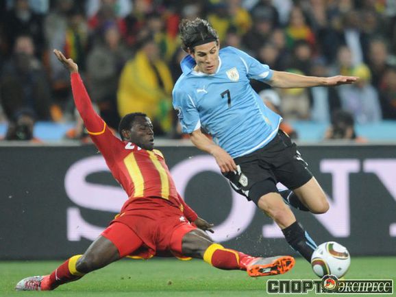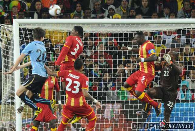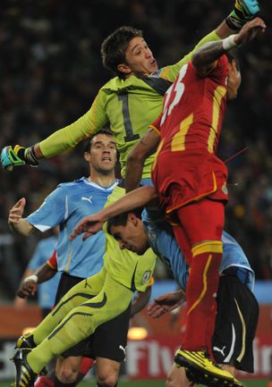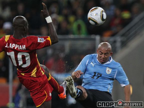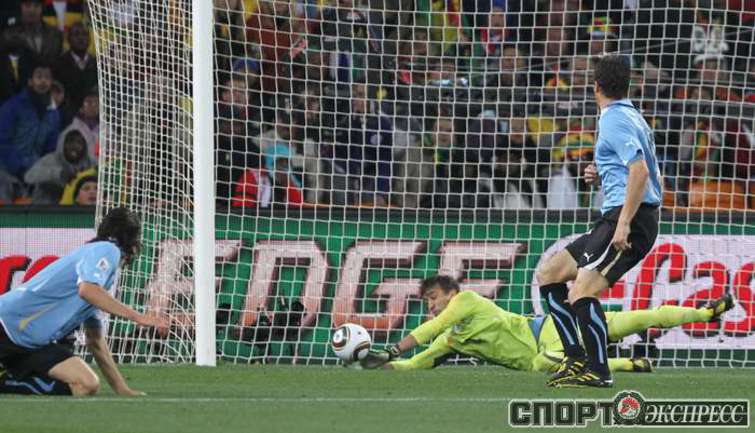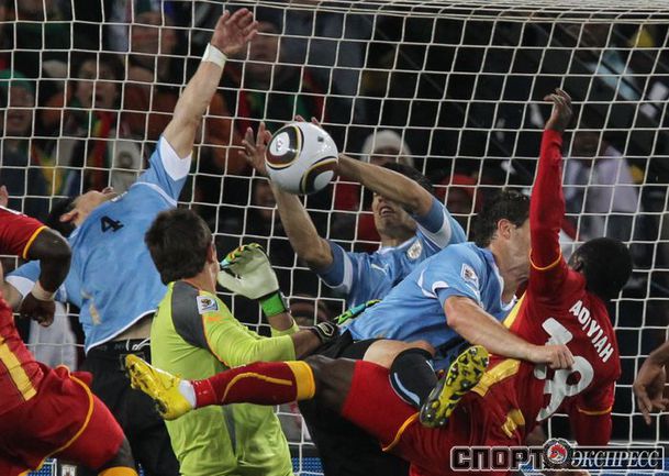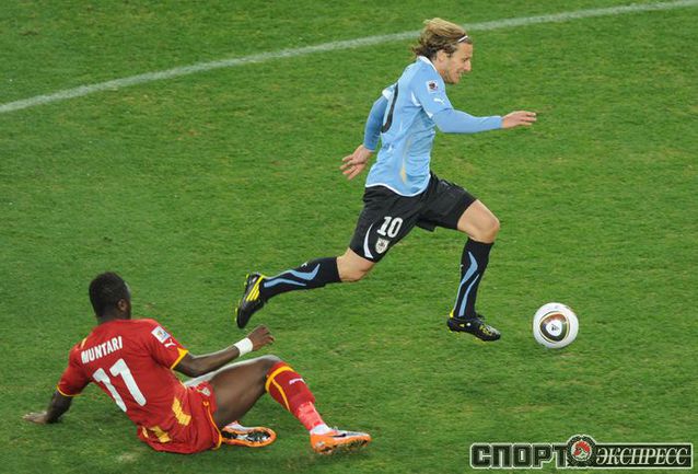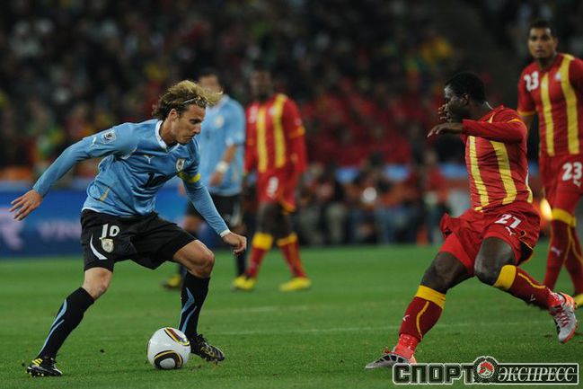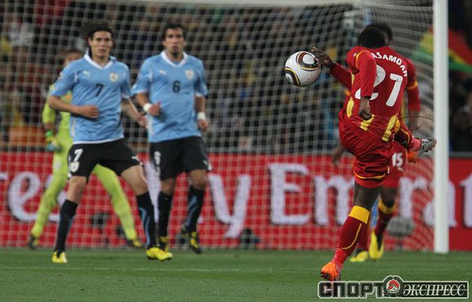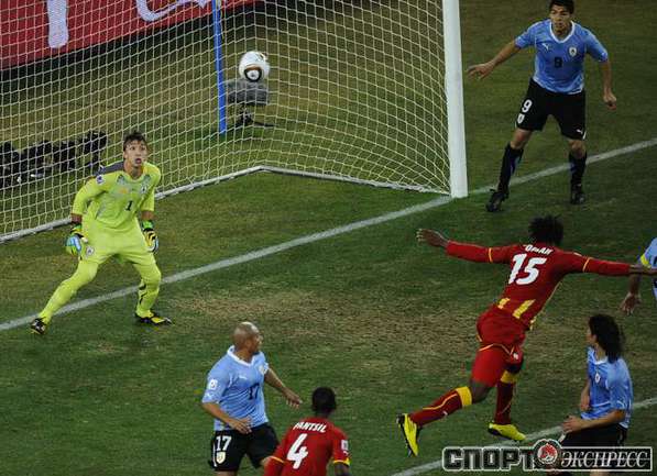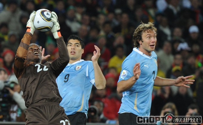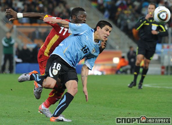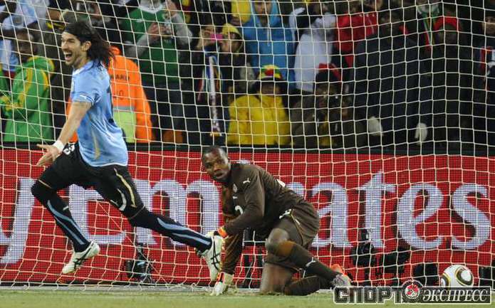2 июля 2010 года. ЧМ-2010. ЮАР. Йоханнесбург. 1/4 финала. Уругвай - Гана - 1:1, пен. - 4:2. Голы: Мунтари, 45+2 (0:1). Форлан, 55 (1:1). Нереализованный пенальти: Гьян, 120+2 (перекладина). Серия пенальти: Форлан - 1:0. Гьян - 1:1. Викторино - 2:1. Аппиа - 2:2. Скотти - 3:2. Менса - 3:2 (вратарь). Макси Перейра - 3:2 (мимо). Адийя - 3:2 (вратарь). Абреу - 4:2. Фото AFP