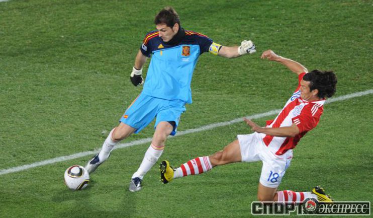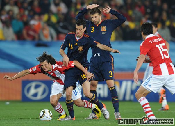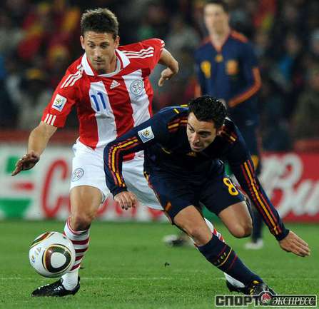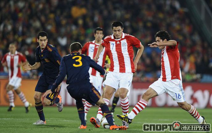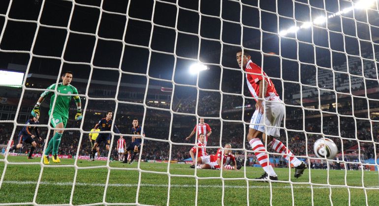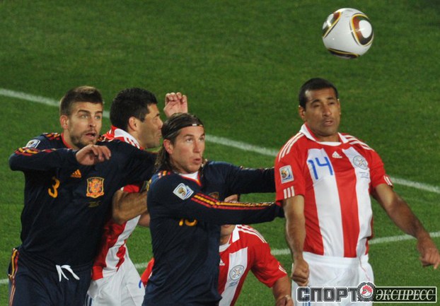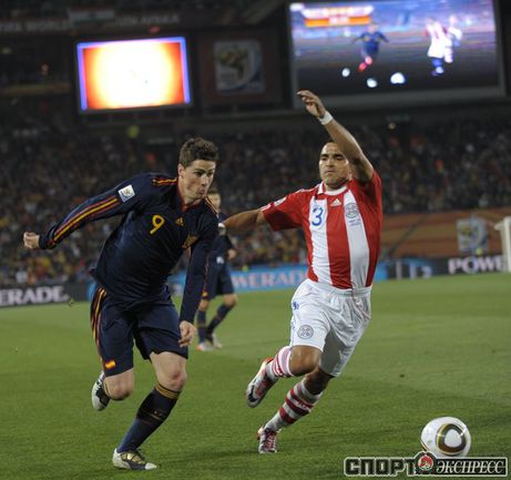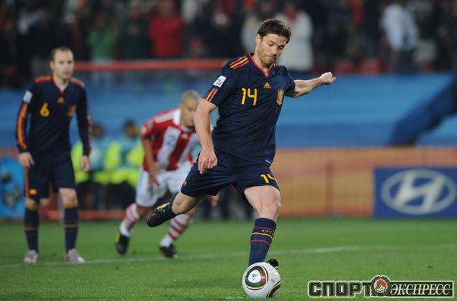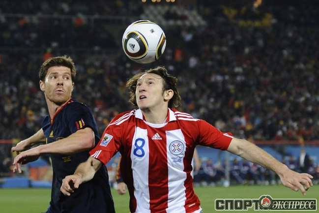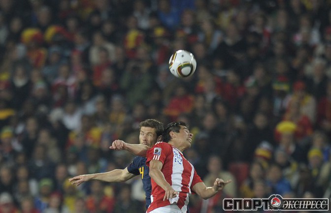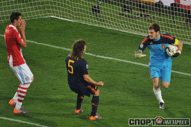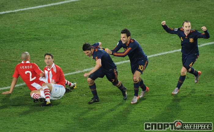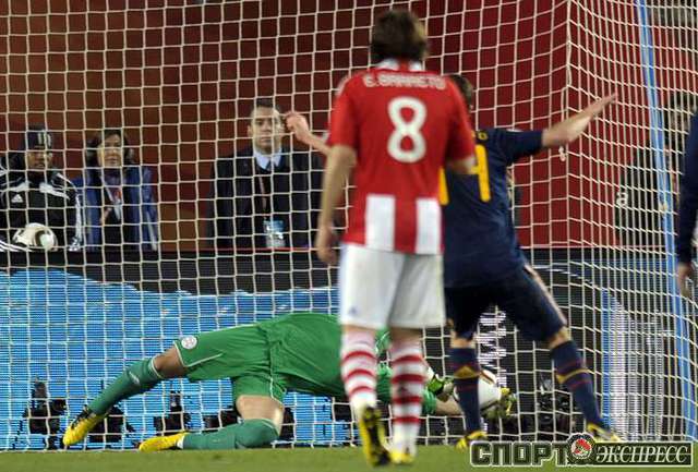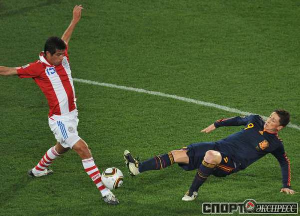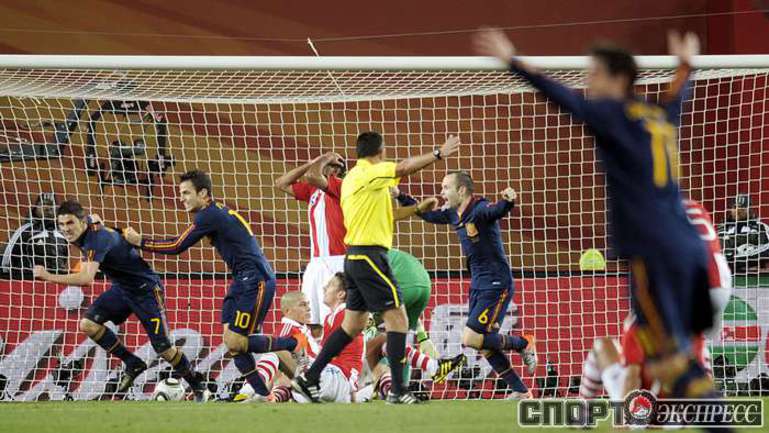 3 июля 2010 года. ЧМ-2010. ЮАР. Йоханнесбург. "Эллис Парк". 1/4 финала. Парагвай - Испания - 0:1. Гол: Вилья, 83. Нереализованные пенальти: Кардосо, 59 (вратарь), Хаби Алонсо, 62 (вратарь). Фото REUTERS, AFP