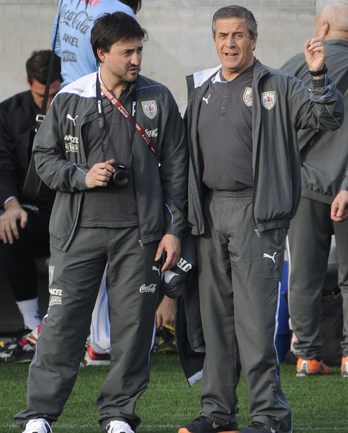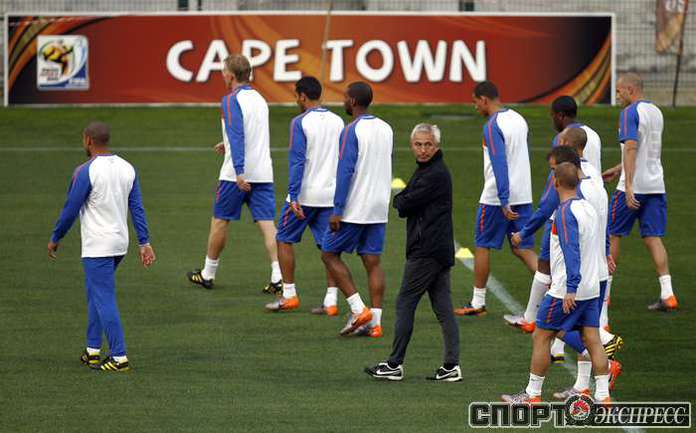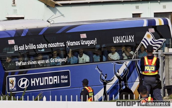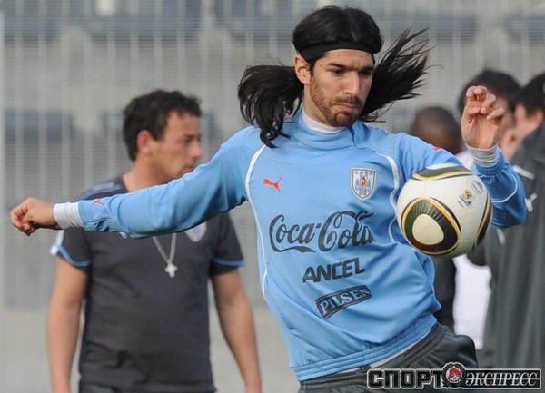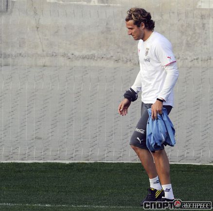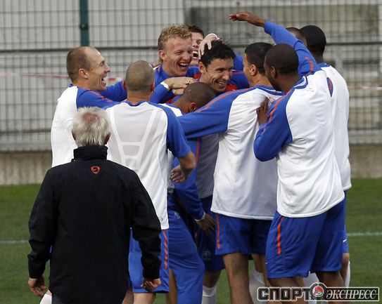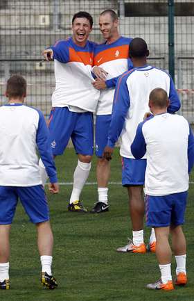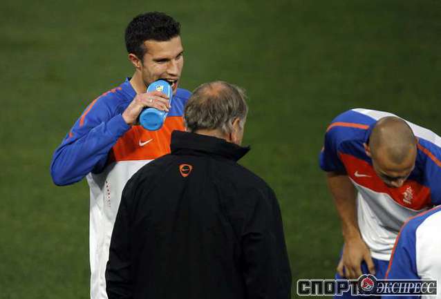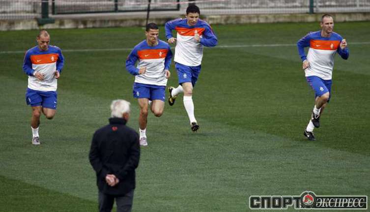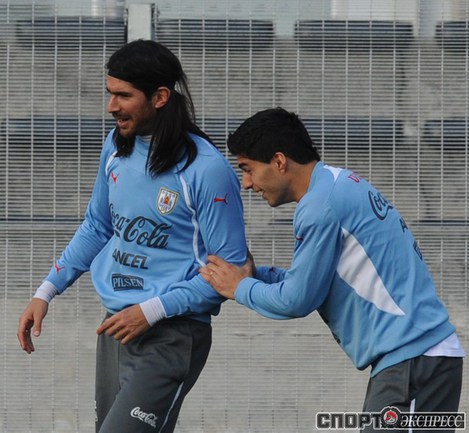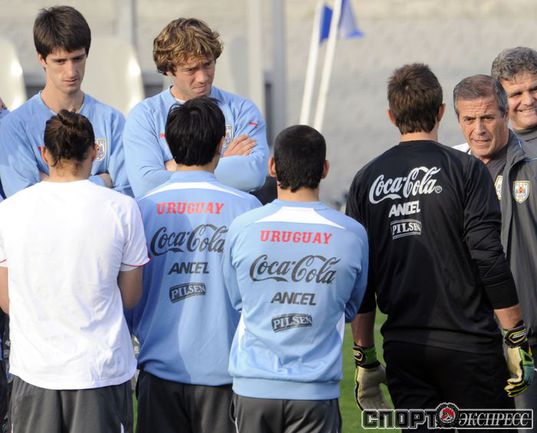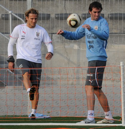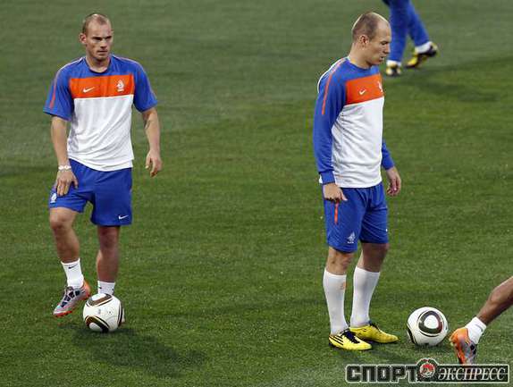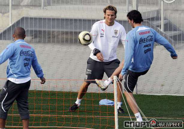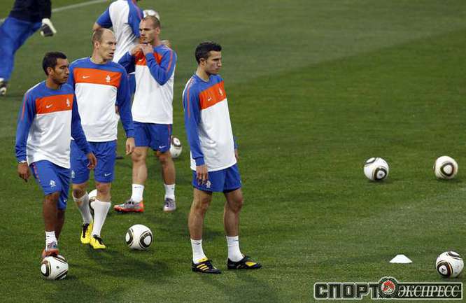 Полуфиналисты ЧМ-2010 сборные Уругвая и Нидерландов готовятся к противостоянию в Кейптауне. Первый матч за выход в финал мирового первенства состоится в этом городе на стадионе "Грин Пойнт" 6 июля 2010 года. В составах команд тренируются их лучшие бомбардиры на ЧМ-2010 Диего Форлан (3 гола) и Весли Снайдер (4). Фото AFP