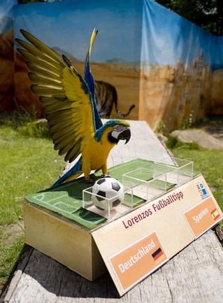Чемпионат мира по футболу в ЮАР. Пока коаманда Йоахима Лева готовится к полуфиналу с испанцами, попугай Лоренцо из немецкого зоопарка в Ганновере предсказал в этом матче победу сборной своей страны. Фото AFP