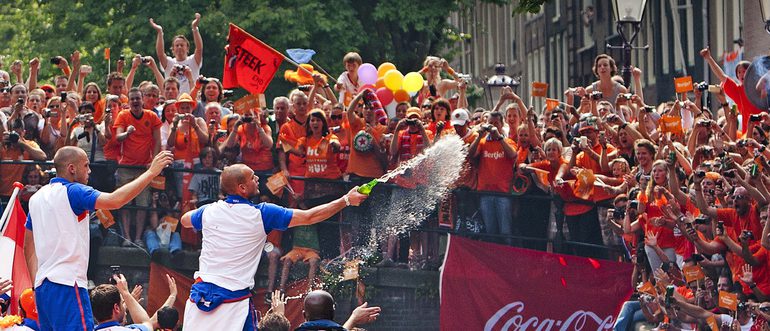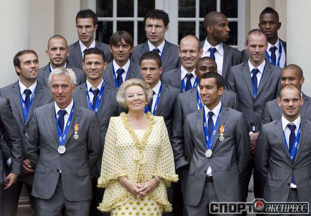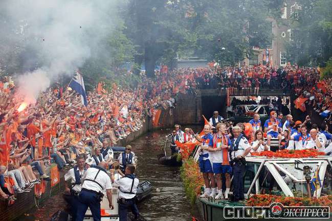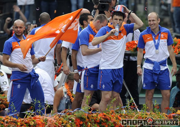 Футболисты сборной Голландии, завоевавшие серебряные медали ЧМ-2010, после возвращения из ЮАР были приняты королевой Нидерландов Беатрикс в королевском дворце Noordeinde в Гааге, встретились с премьер-министром страны Жаном Питером Балкененде, а затем прокатились по каналу в Роттердаме на глазах у десятков тысяч счастливых болельщиков. Фото AFP