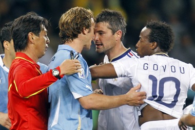 Во втором матче первого игрового дня сборные Уругвая и Франции в третий раз подряд завершили личную встречу нулевой ничьей: ранее эти команды не смогли открыть счет на групповом этапе ЧМ-2002 и в товарищеском матче 2008 года. На 81-й минуте за вторую желтую карточку был удален уругваец Лодейро, но даже это обстоятельство не помогло вице-чемпионам мира французам одержать победу.