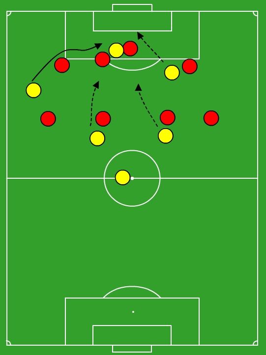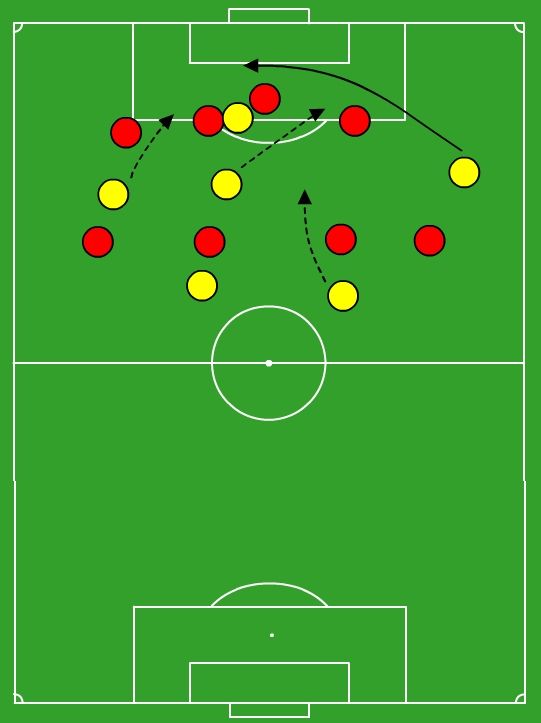 Интересное сочетание, позволяющее обеспечить соперника работой и вверху, и внизу. В этом варианте мячи будут доставляться в штрафную как для ударов головой и скидок партнеру, так и для передач на ход как форварду, так и фланговым полузащитникам, смещающимся в штрафную.
